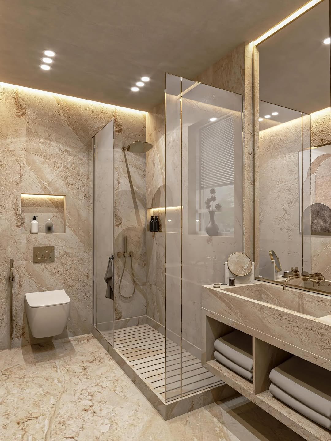 This is full-on hotel energy. Soft beige tones, hidden lighting, and that sleek glass shower make the whole space feel elevated and calm.