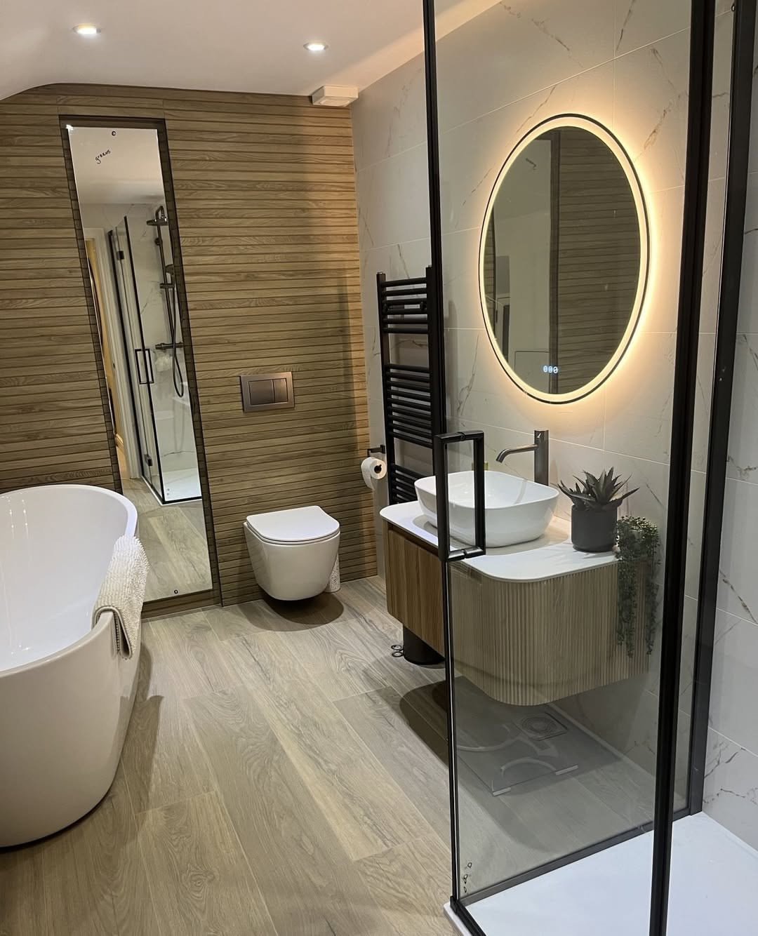 The floating vanity and round LED mirror add that modern polish. It’s clean, sharp, and honestly feels like stepping into a boutique hotel every morning.
