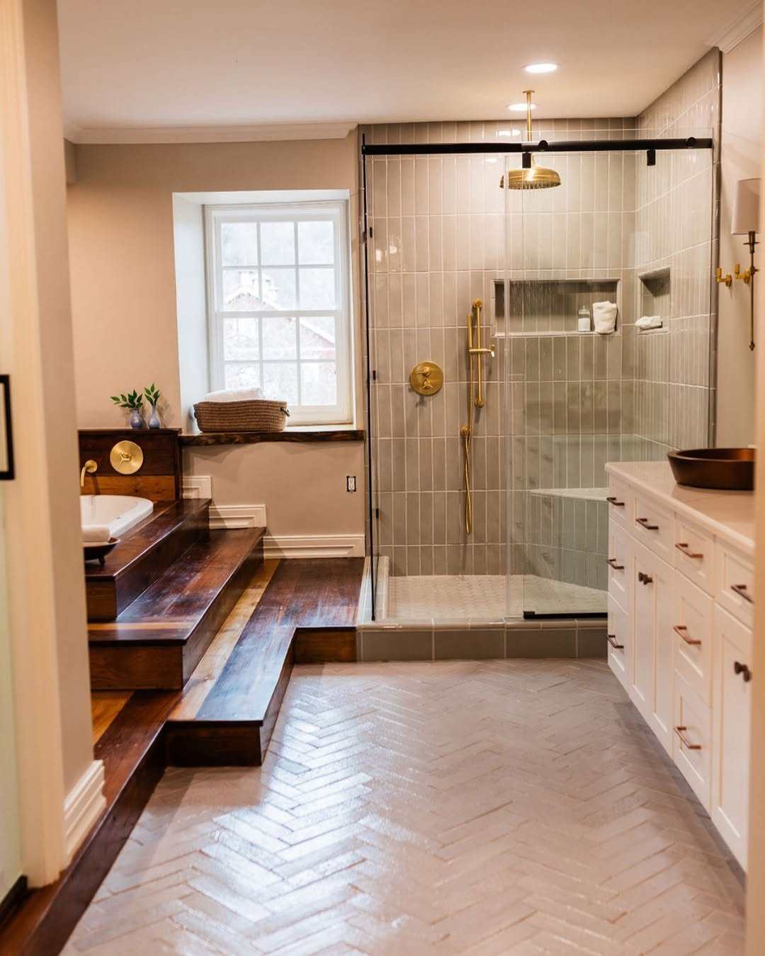 There’s something really timeless about this one. The mix of soft patterned flooring and clean vertical tiles keeps it interesting without trying too hard.