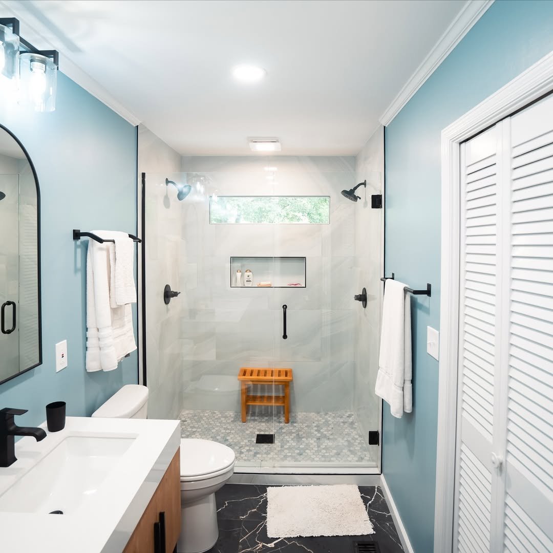 Light blue walls instantly make this space feel airy and fresh. Paired with white tiles and simple black accents, it hits that clean-but-not-sterile sweet spot.
