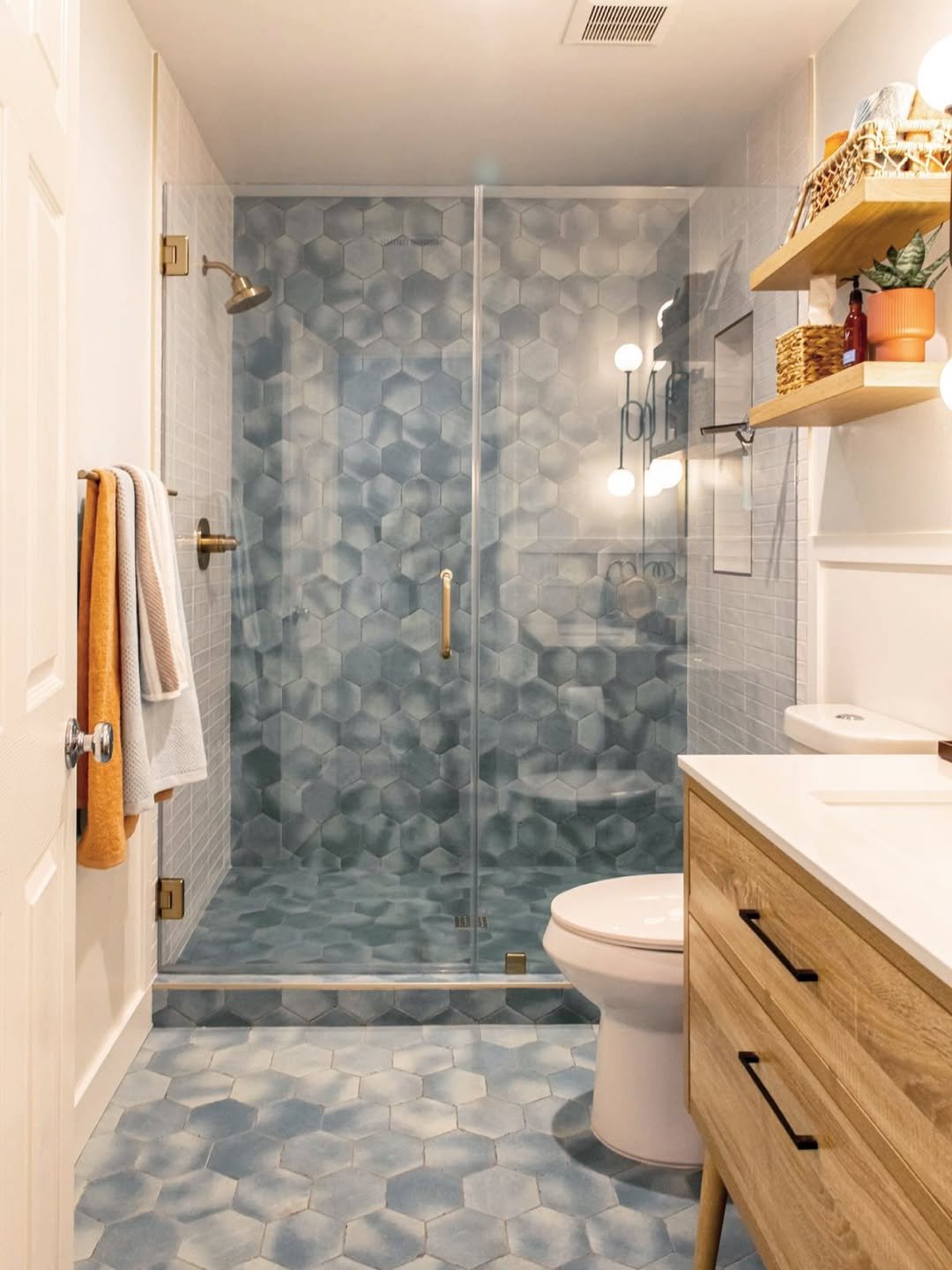 Now this is how you make a small space feel fun. The blue hex tiles instantly grab attention, turning the shower into the main character without overwhelming everything else.