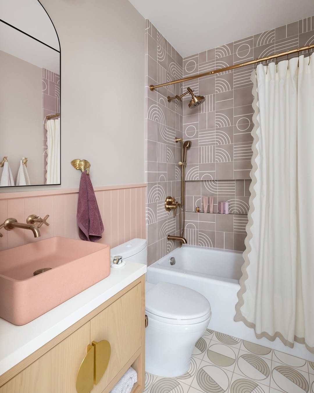 This one has personality in the best way. The soft pink tones, geometric tiles, and brass accents feel playful but still refined.
