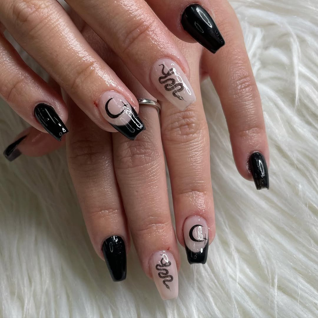 These nails lean into a darker, moodier vibe—and honestly, they look so cool. The glossy black nails contrast beautifully with the nude accent nails featuring sleek snake artwork.