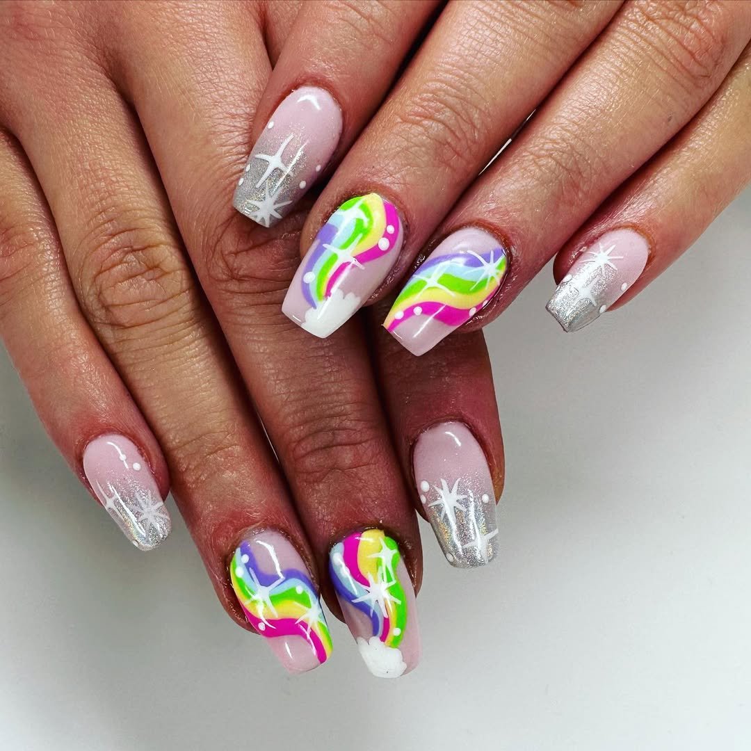 This set is pure color energy. The nude base lets the bright rainbow swirls take center stage, creating a bold, retro-inspired design that instantly grabs attention.
