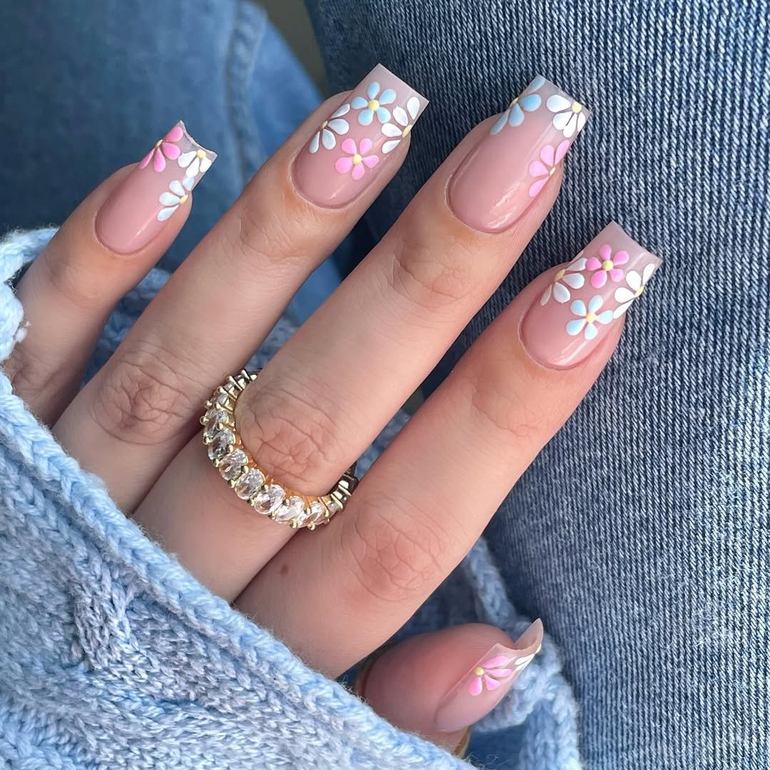 This manicure feels like springtime in nail form. The soft nude base is decorated with pastel daisy flowers scattered along the tips, creating a design that’s cheerful and fresh.