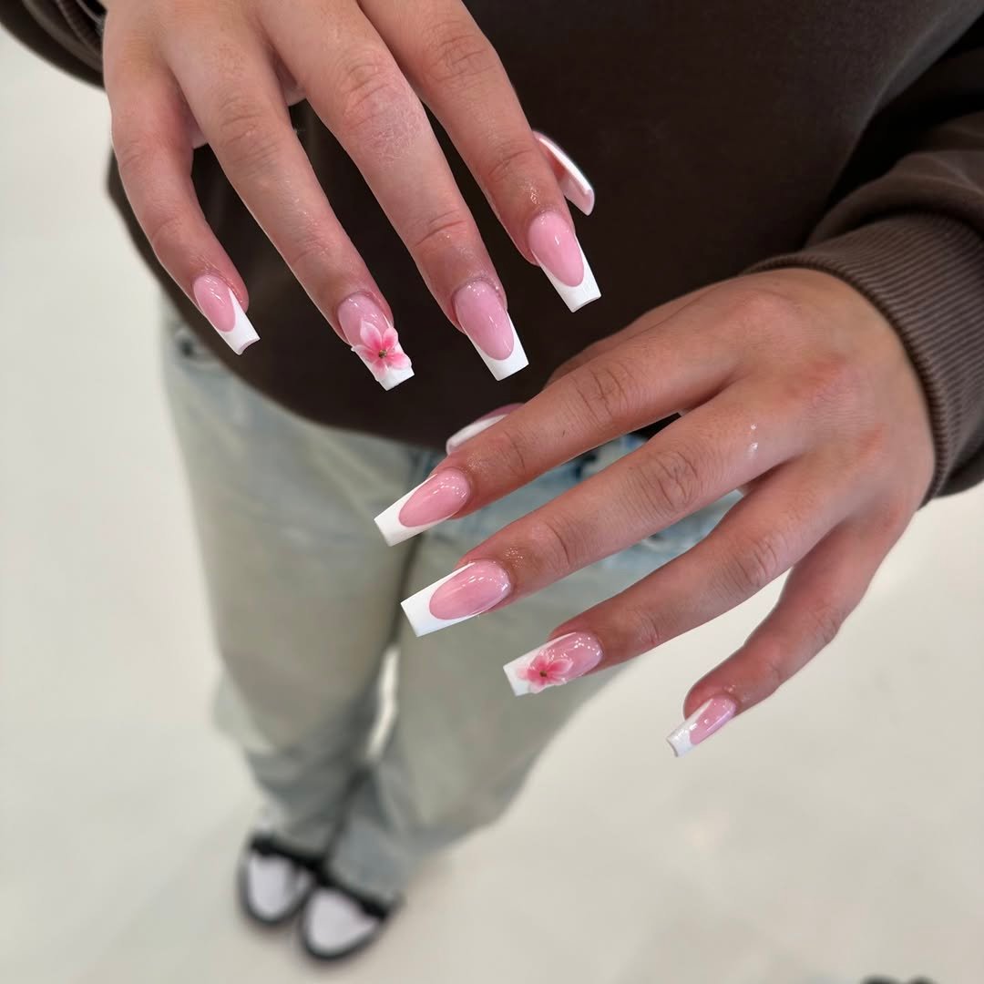 This set is the definition of soft elegance. The glossy pink base paired with crisp white French tips already gives that timeless manicure vibe, but the delicate floral accent takes it somewhere extra special. It feels fresh, feminine, and effortlessly pretty.