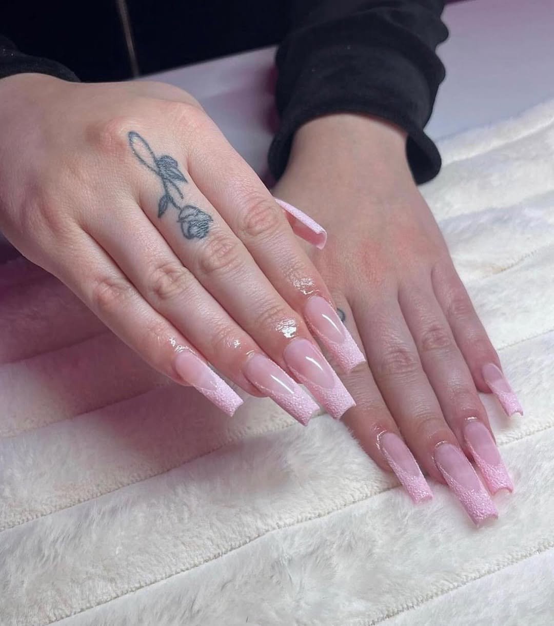 These nails have that dreamy, soft-glam vibe. The glossy nude base paired with textured pink tips creates a design that feels delicate but still eye-catching.