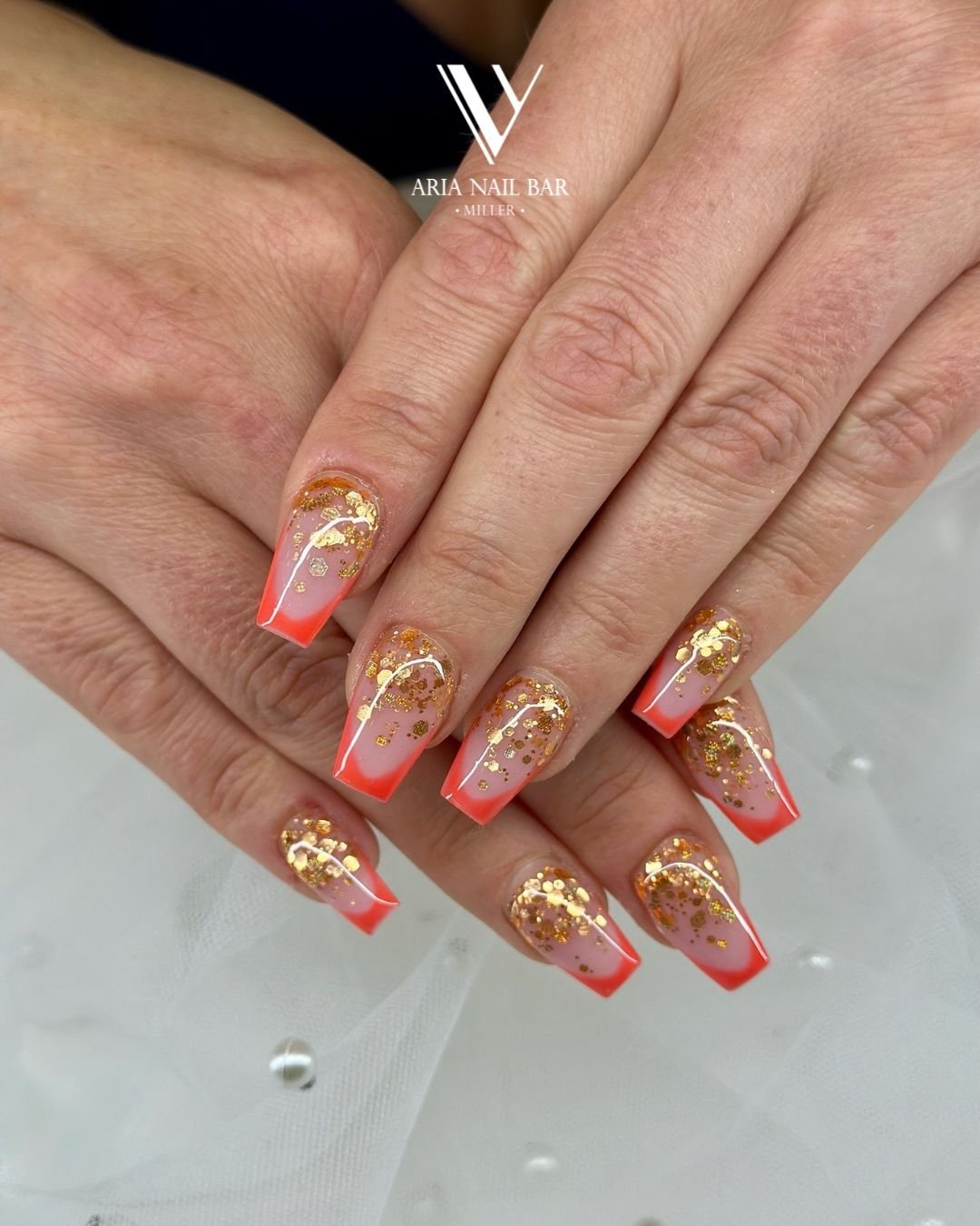 These nails feel like golden hour captured in a manicure. The coral-orange gradient melts beautifully into the nude base, while those scattered gold flakes add that warm, glowing shimmer.