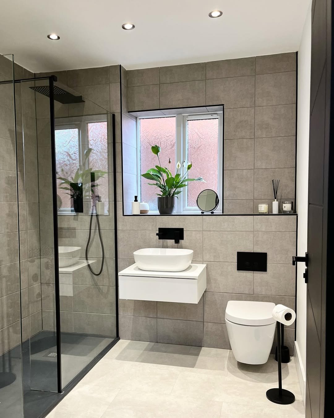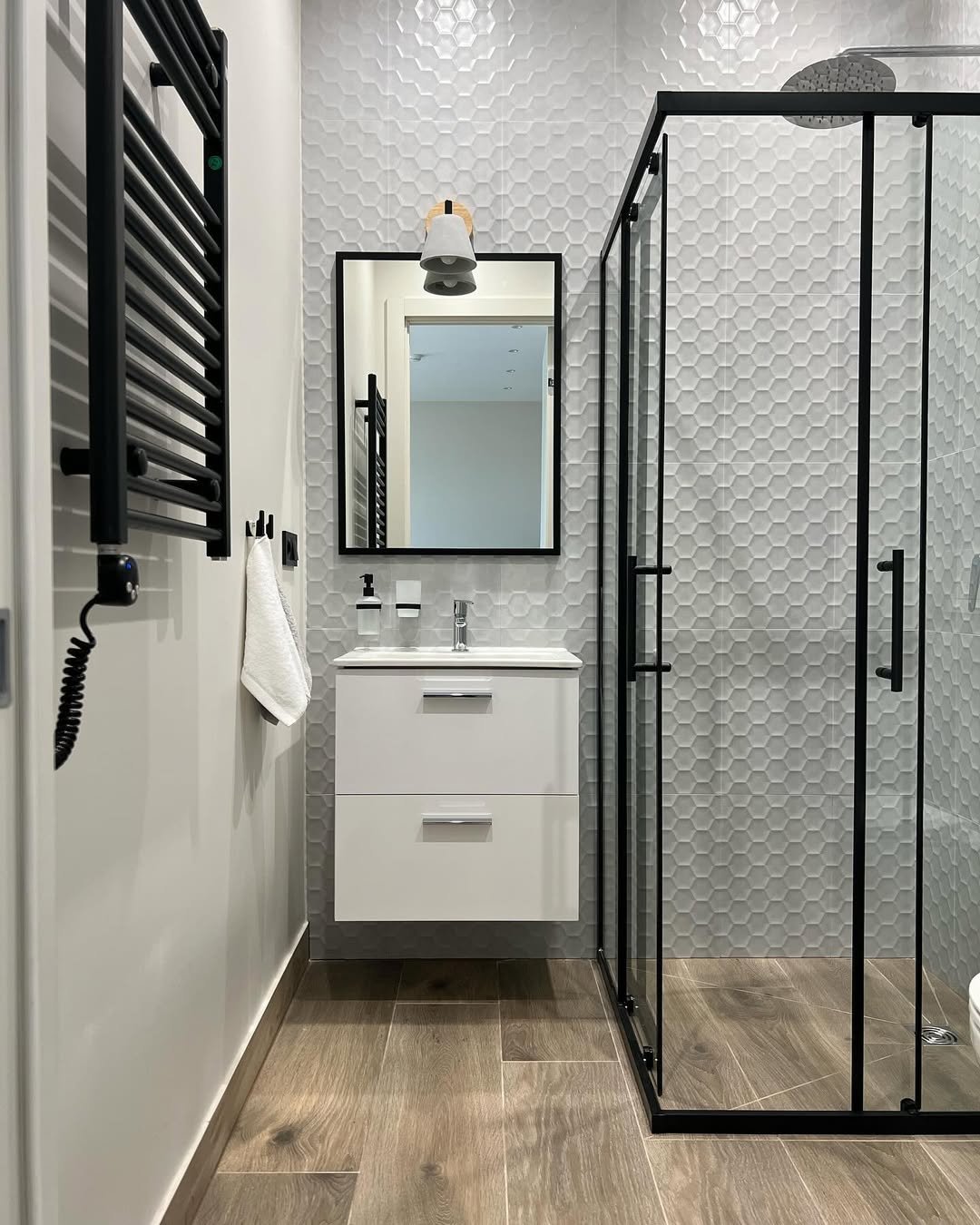 This one leans into texture, and it pays off. The geometric wall tiles add depth, while the black-framed glass keeps things sharp and modern.
