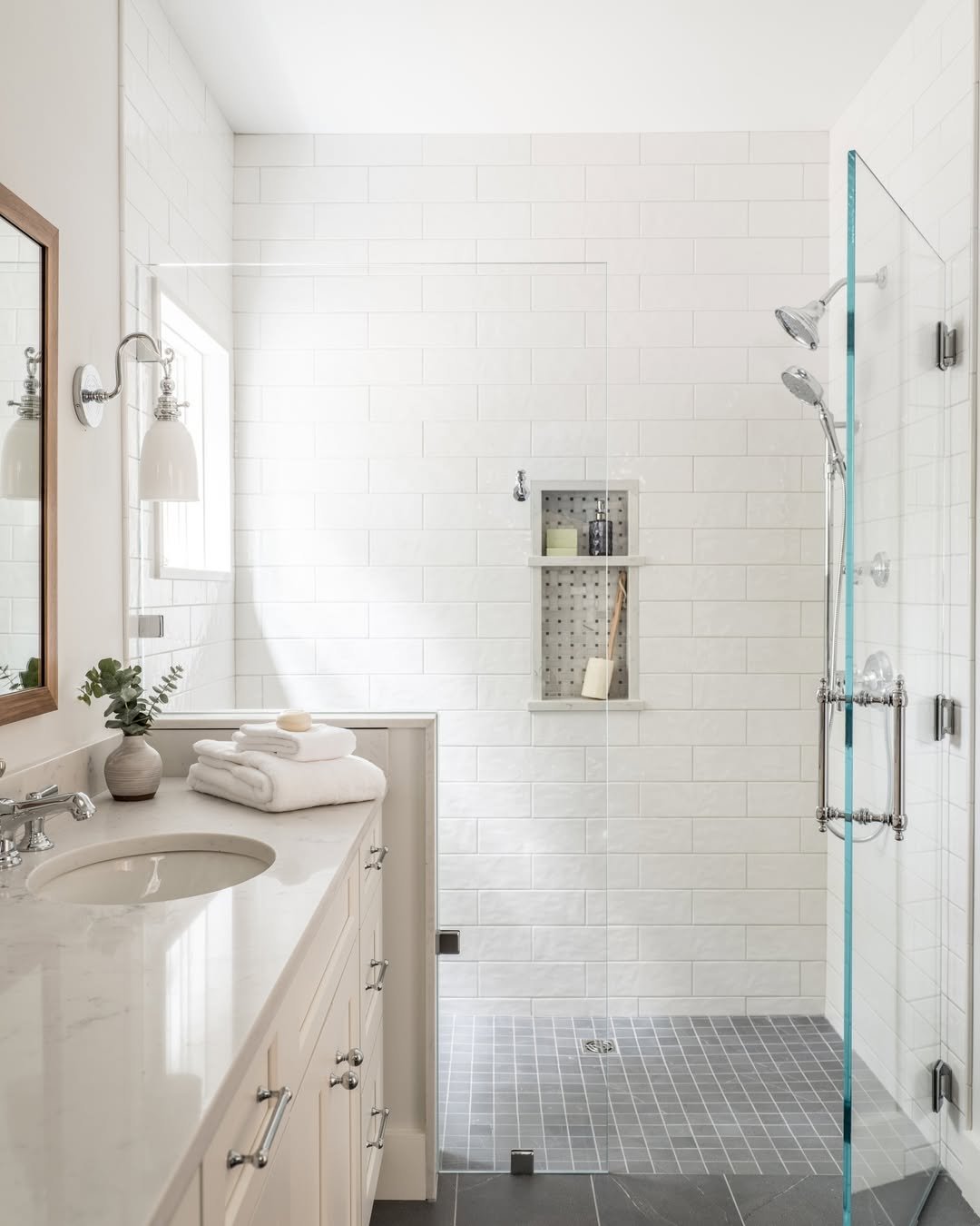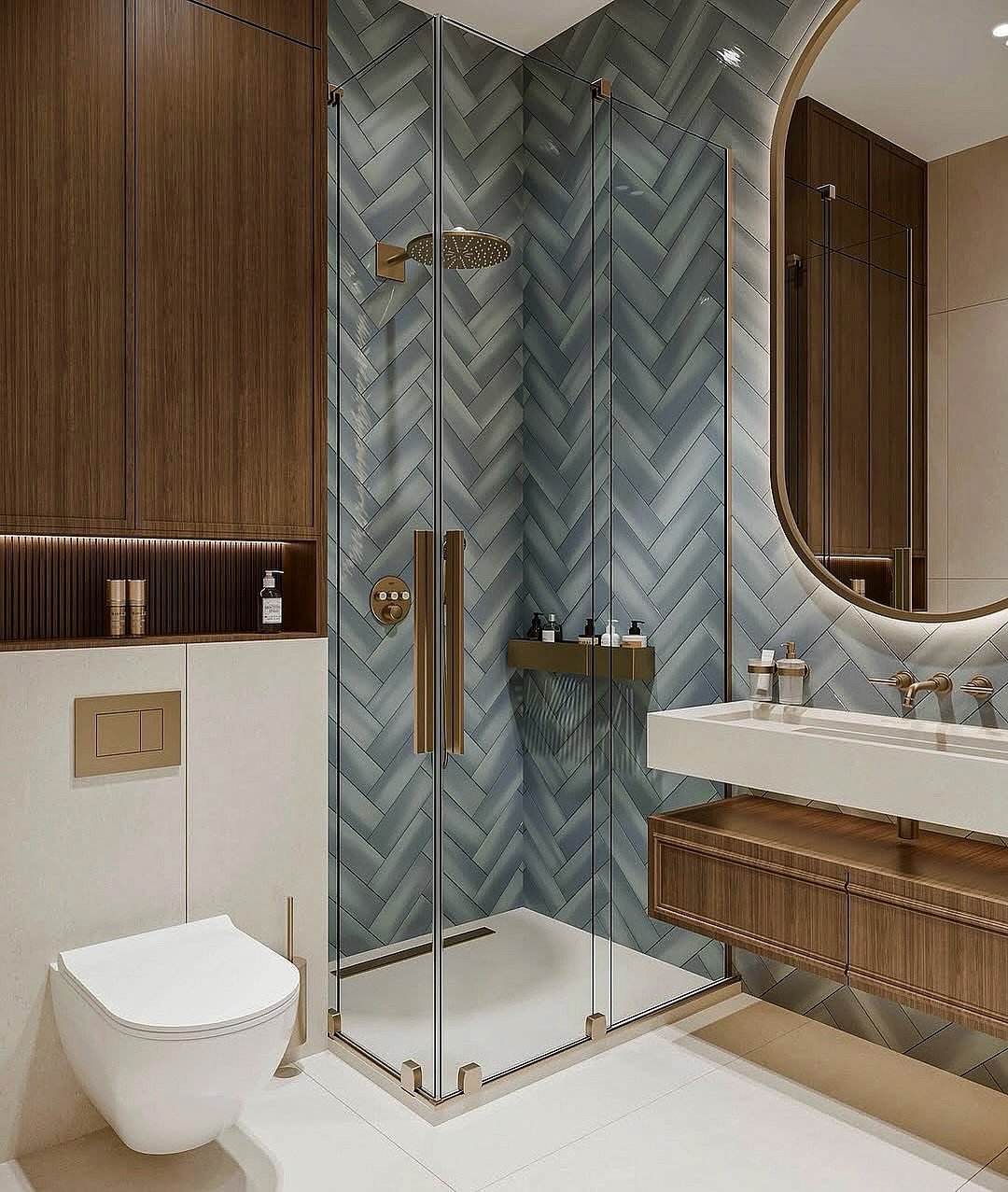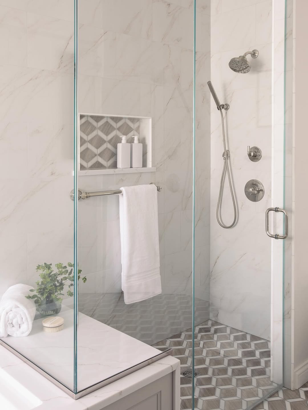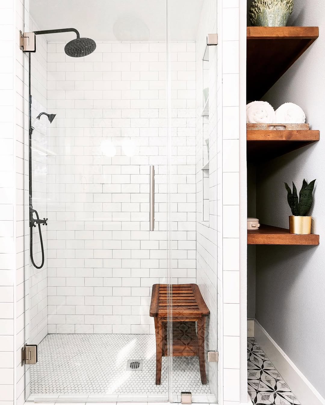 Now this is how you make a small shower feel like a moment. That herringbone tile instantly pulls your eye in, adding depth and movement without needing extra space.