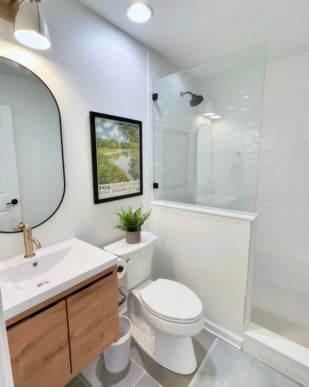 This one is proof you don’t need a ton of space to make things feel put together. The compact layout flows so smoothly—vanity, toilet, shower—all tucked in without feeling cramped. That half-glass shower wall keeps everything open while still doing its job.