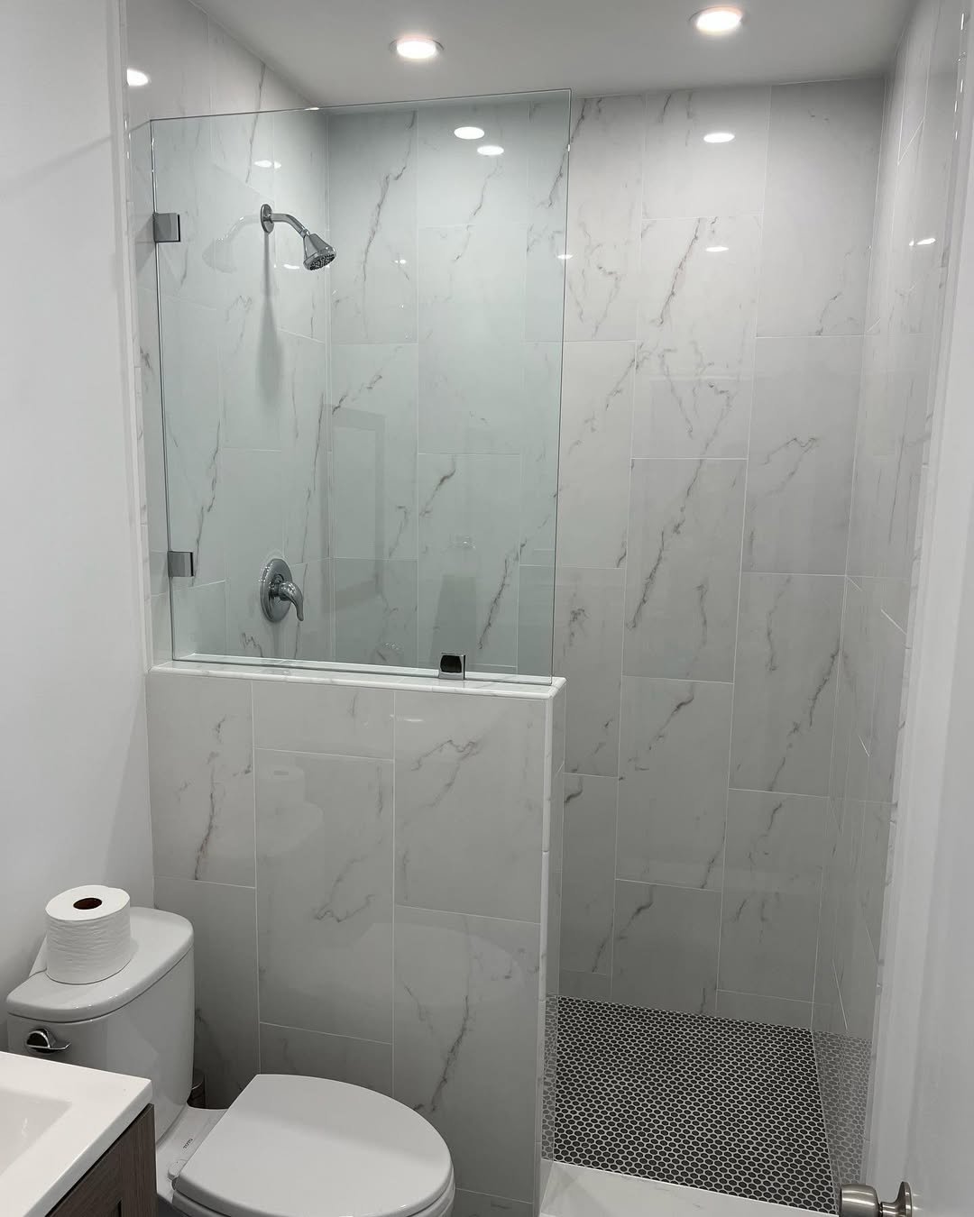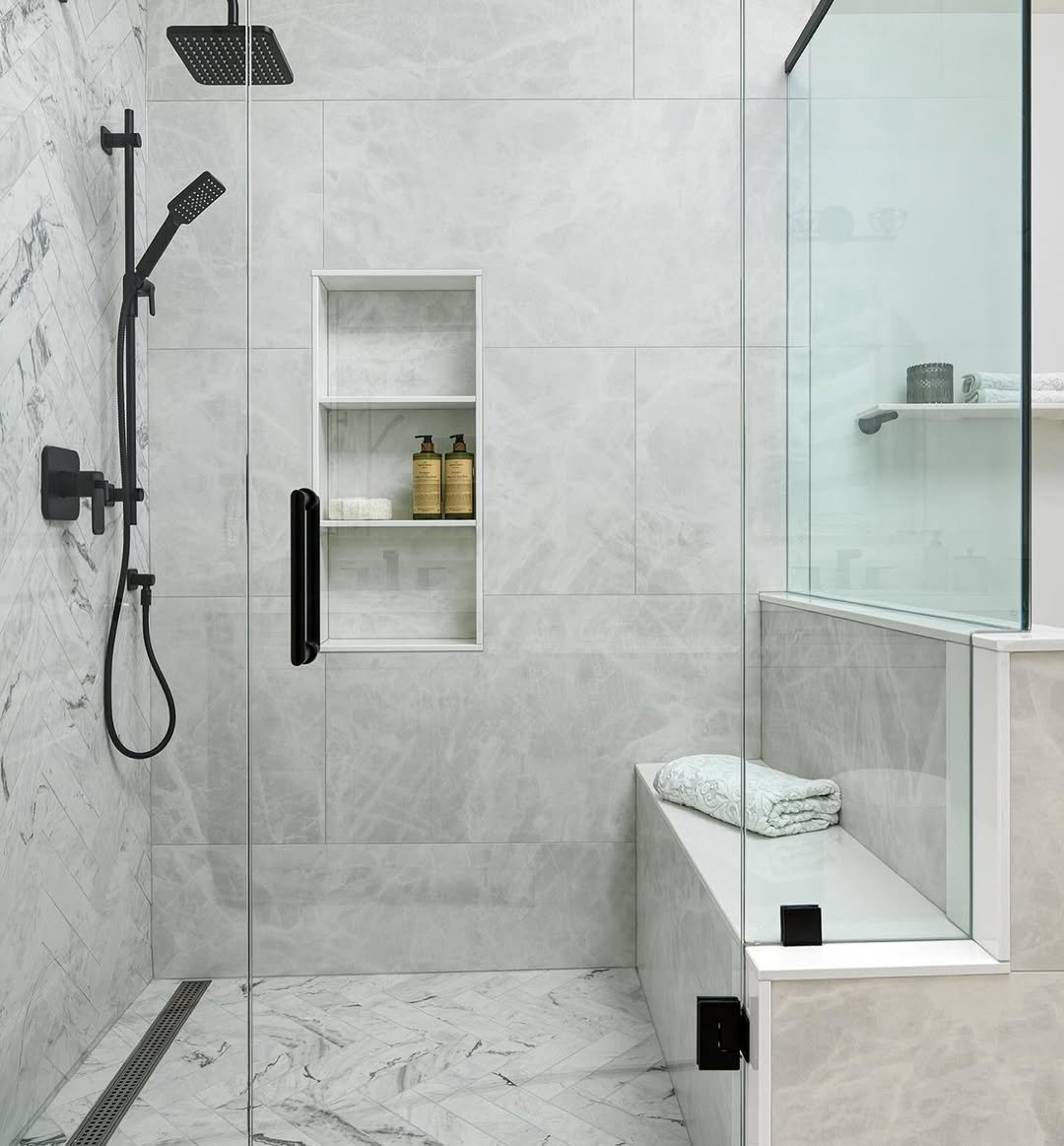 This is what happens when you keep things simple but elevate the materials. The large marble-look tiles instantly make the space feel bigger and way more polished.