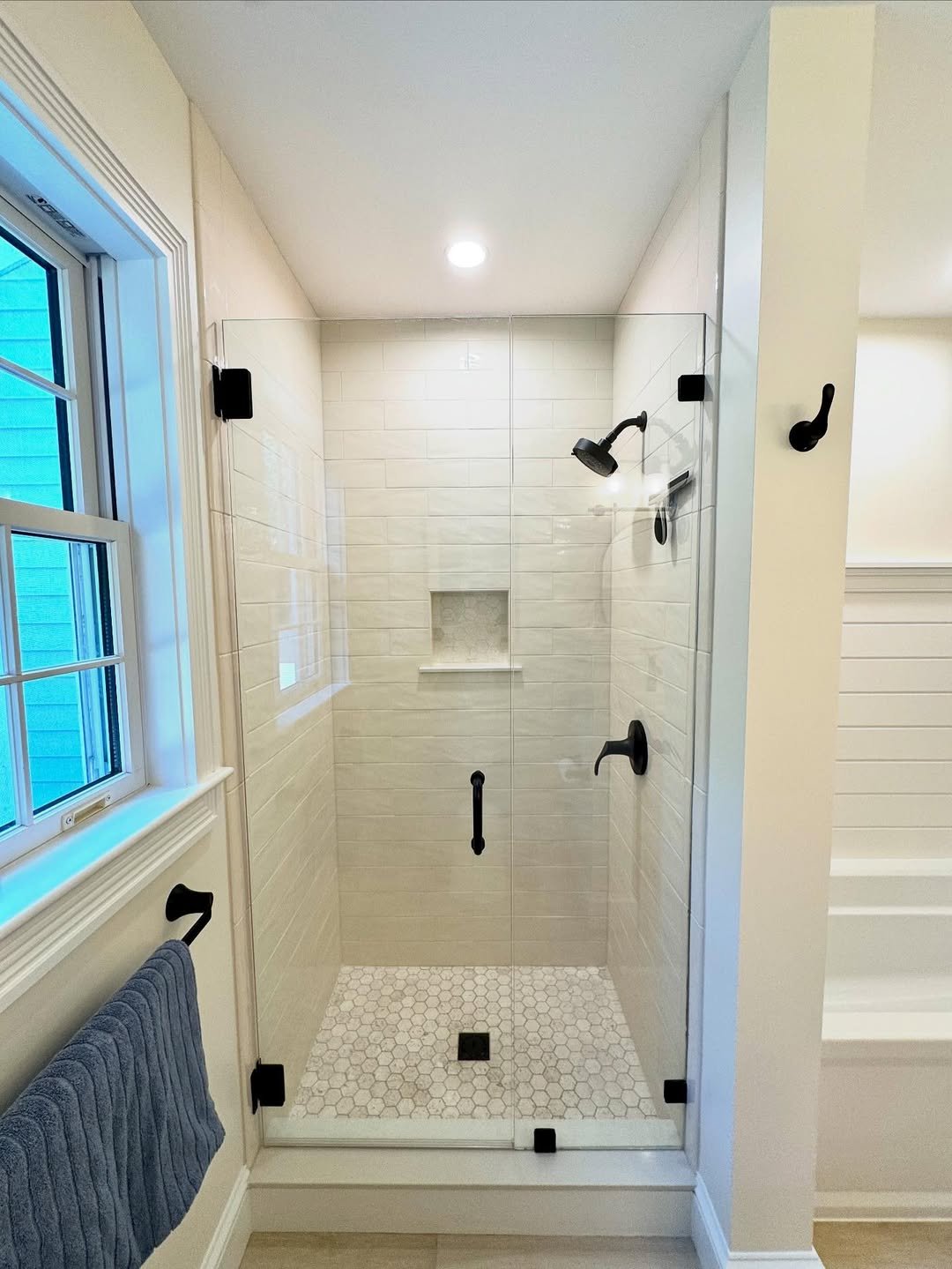 This one goes a little bolder—and it pays off. The black grid shower frame adds structure and definition, especially in a small space.