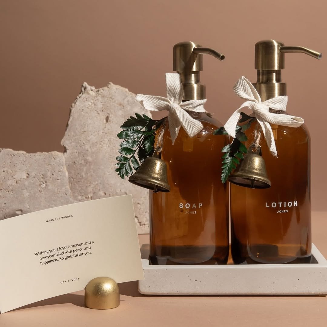 This one feels like a little seasonal moment you didn’t know your sink needed. The amber glass bottles already bring that warm, cozy glow, but then you add the bows, greenery, and tiny bells—and suddenly it’s giving festive but still elevated. Not over-the-top holiday decor, just a soft nod to it.