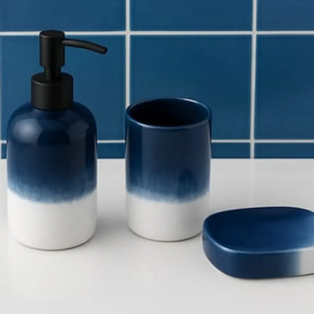 This gradient blue set is giving calm, coastal energy without going full beach theme. The fade from deep blue to white feels fresh and airy, especially against those tiled walls—it’s like a little ocean moment right on your sink.