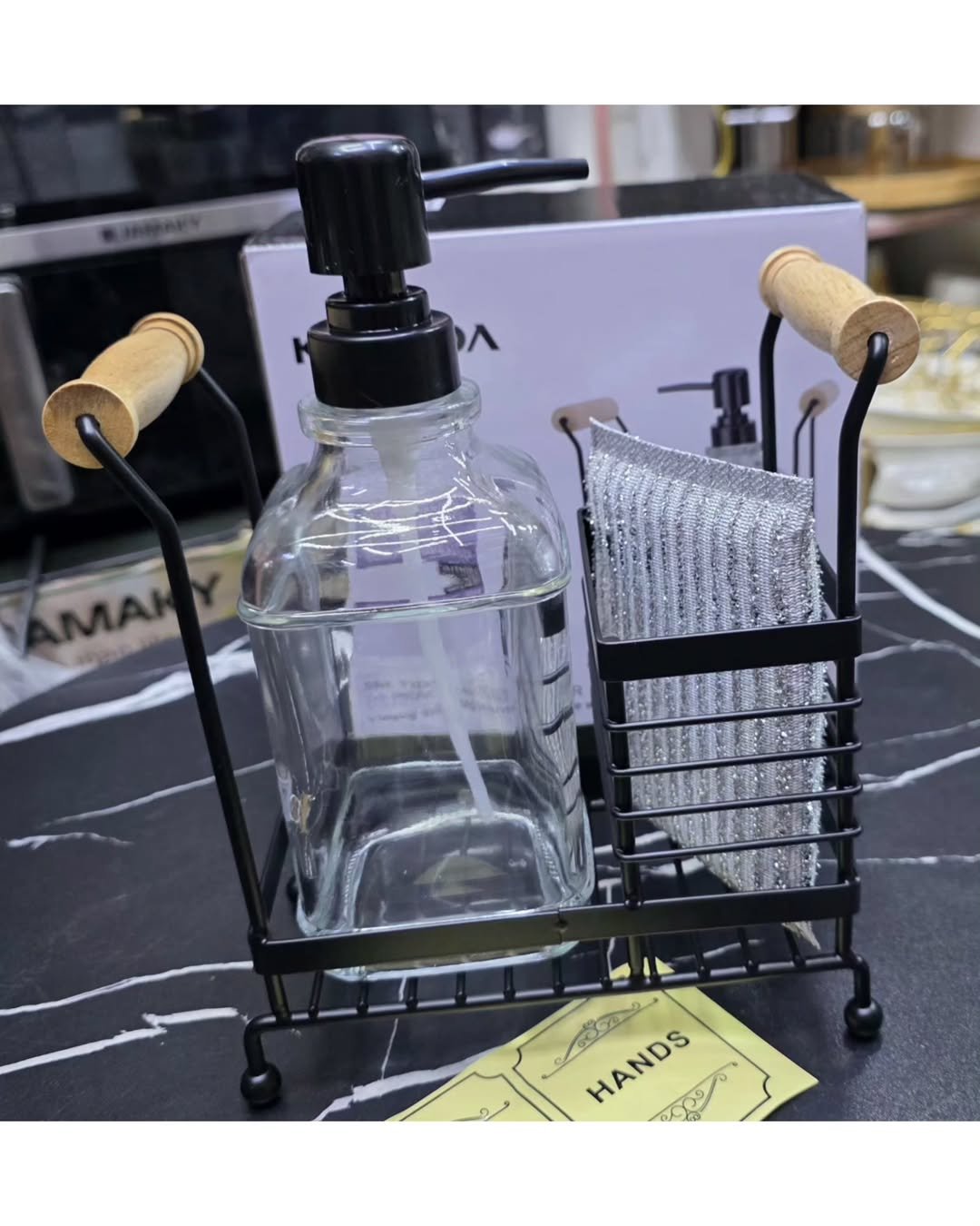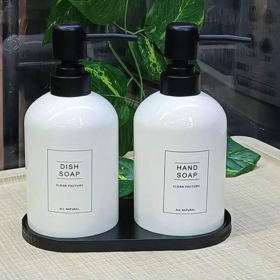 This one is all about bold simplicity. The matte black bottles with clean labeling are sharp, modern, and super functional. “HANDS” and “DISHES” right there—no guessing, no clutter, just straight-up clarity with style.