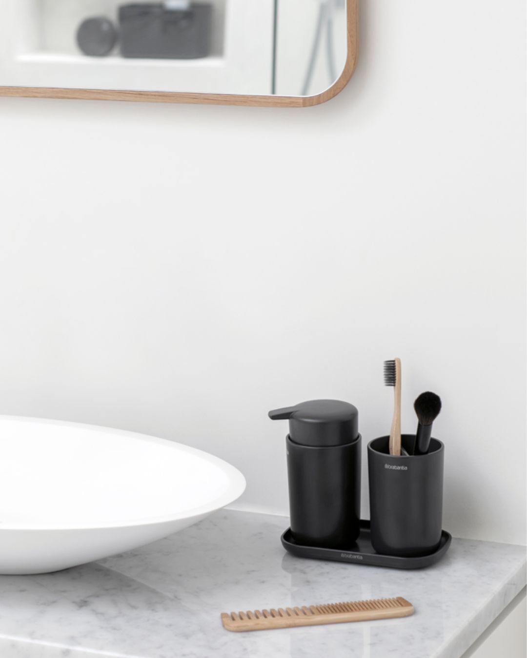 And it’s practical too. You’ve got your essentials—soap, toothbrush holder, tray—all working together without cluttering the space. It’s giving “effortless routine,” where everything just flows.