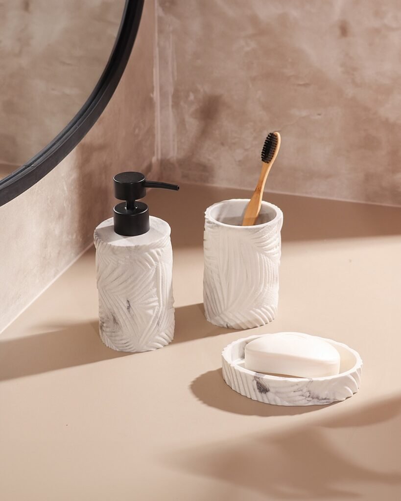 What’s great is how cohesive the whole set is—from the dispenser to the cup to the soap dish. It feels complete, like a mini collection rather than random pieces. Perfect if you want your bathroom to feel a bit more lively and less… predictable.