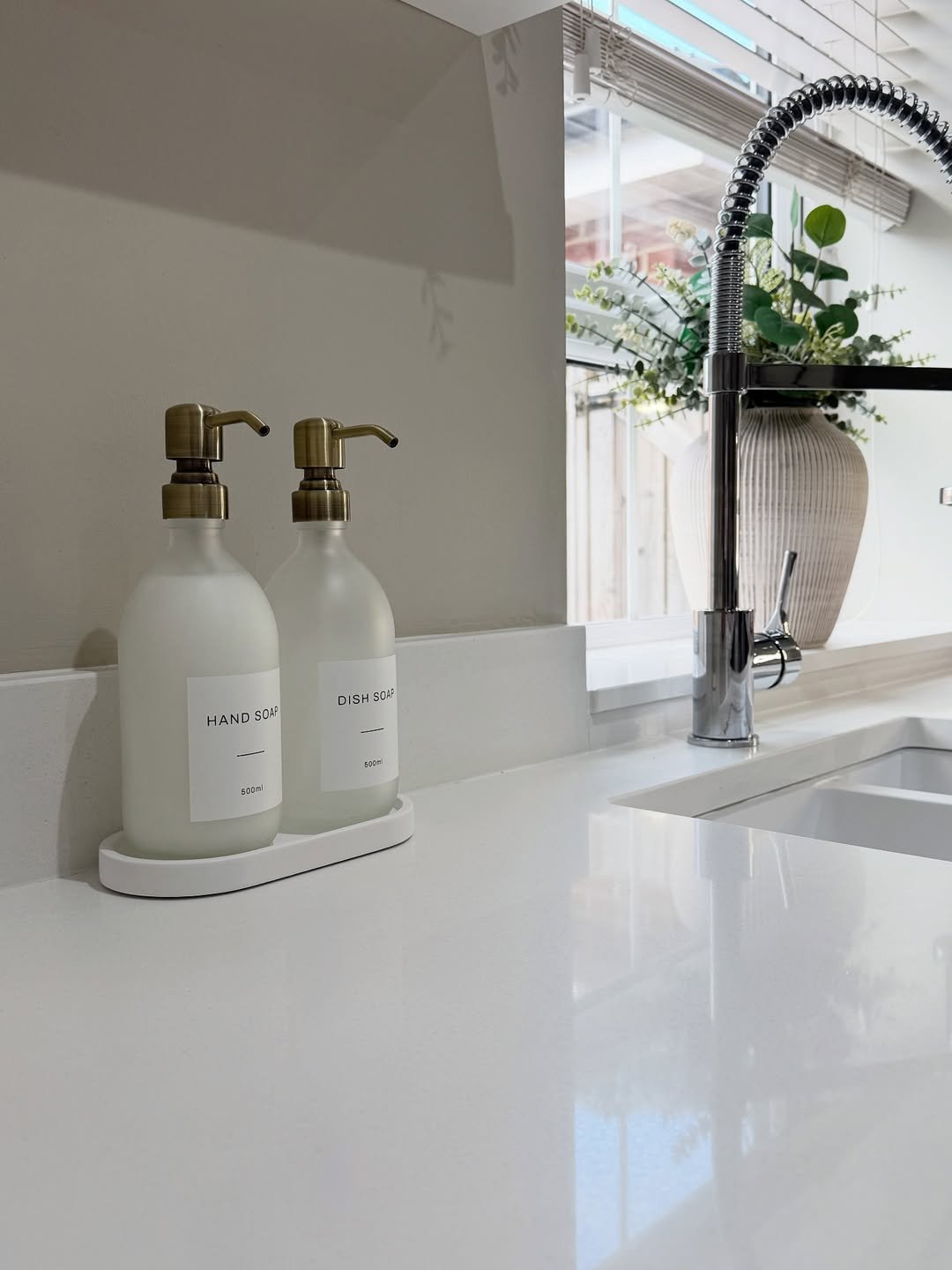 This is minimalism done right. The frosted glass bottles with clean labels and brass pumps feel crisp, modern, and super satisfying to look at. It’s like your kitchen decided to get its act together.