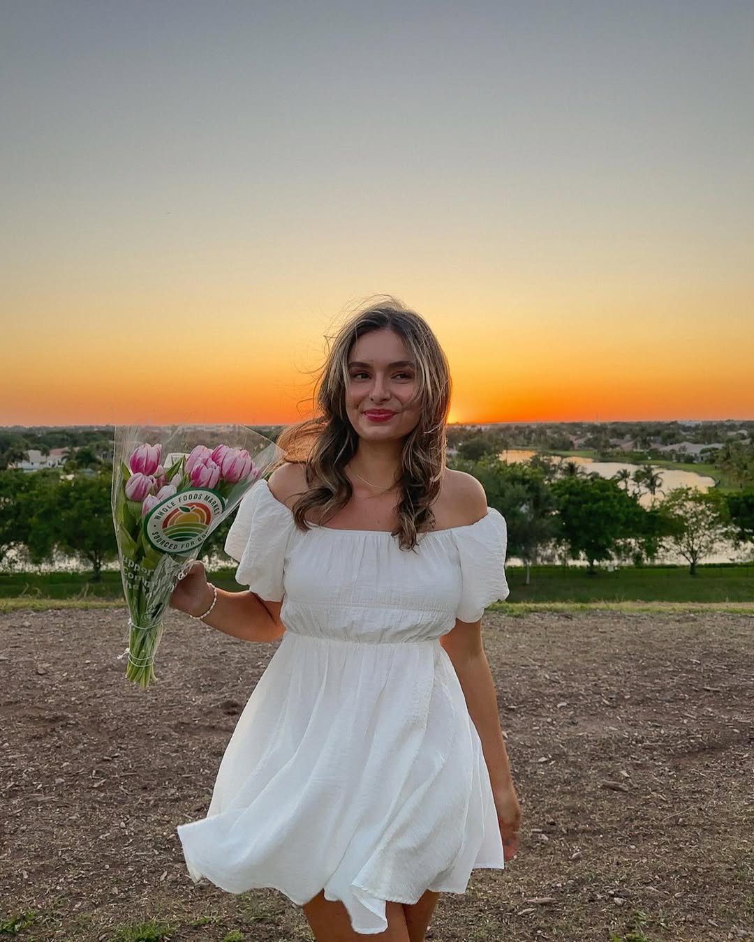 This off-shoulder white dress against a sunset backdrop feels almost cinematic. The gentle structure and flowing skirt create movement that catches the light in the prettiest way.