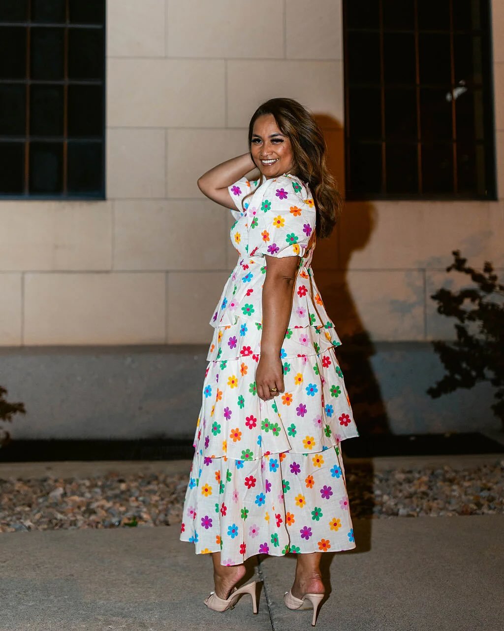 This tiered dress with scattered floral prints brings a playful kind of romance. Each layer adds movement, giving the whole look a light, twirl-worthy feel.