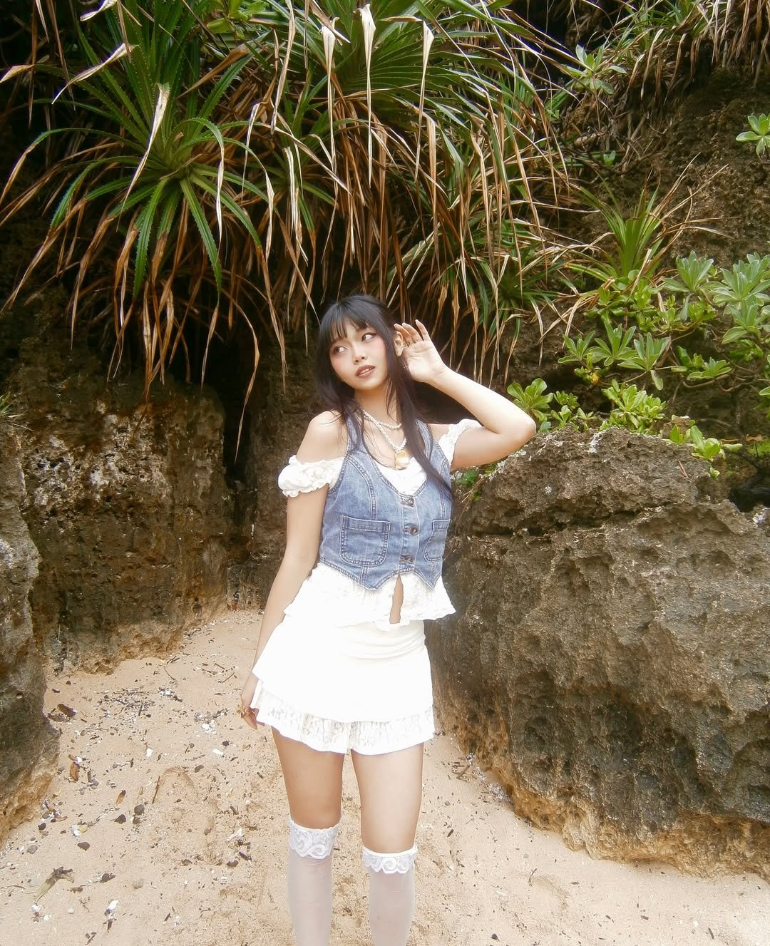 Standing against rocky beach cliffs, the whole look feels carefree and adventurous. It’s the kind of styling that works perfectly for travel days and seaside exploring.
