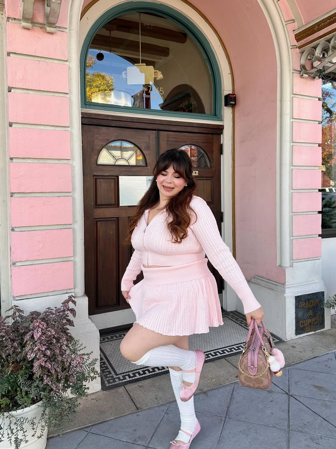 Head-to-toe pink? Always a yes in soft girl world. The cable knit set with a pleated mini skirt feels playful and polished, while the knee-high socks and matching flats lean fully into that coquette aesthetic.