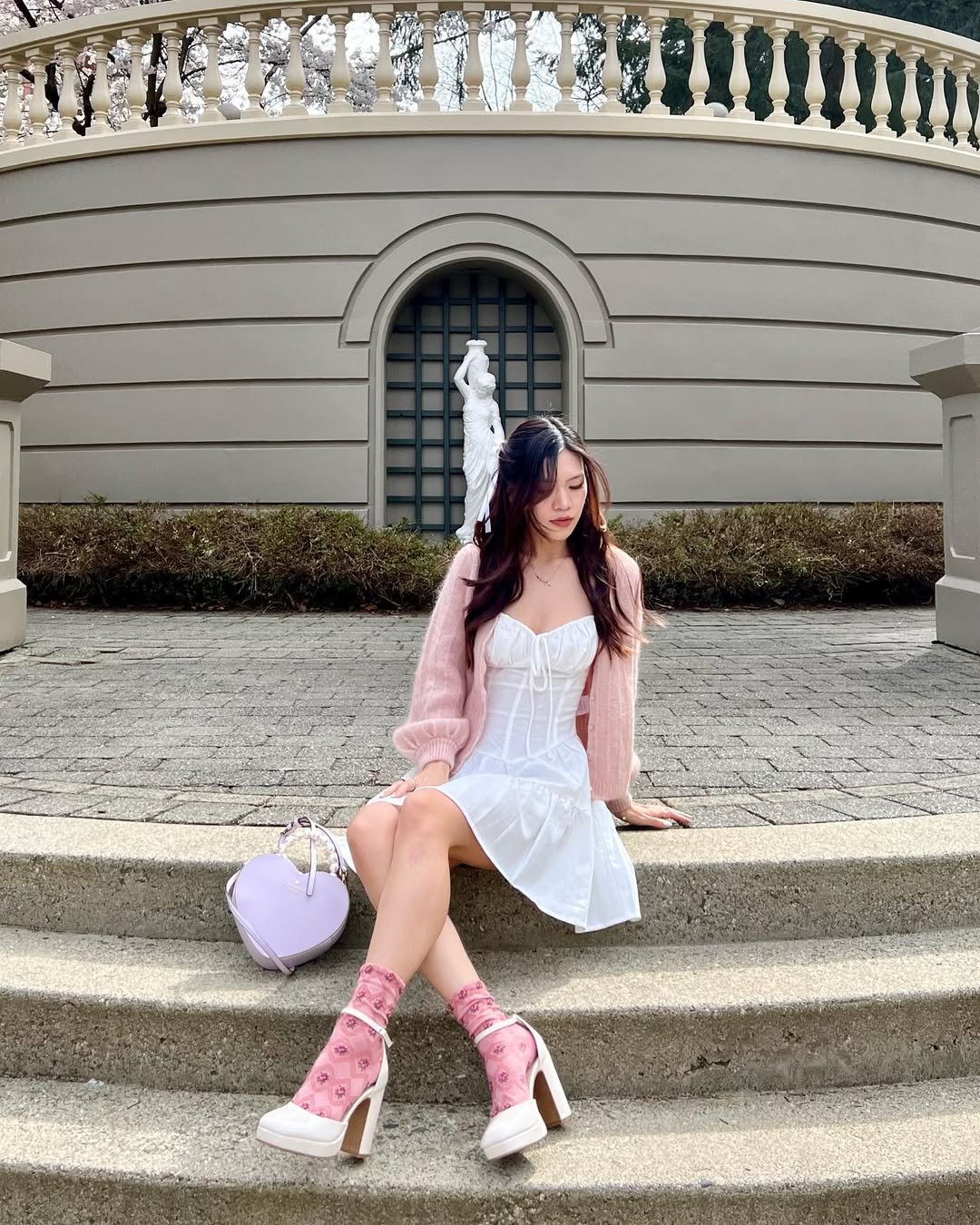 This look feels like it belongs in a dreamy city park somewhere in early spring. The structured white corset dress sets the base, then that soft pink cardigan drapes over the shoulders like the sweetest finishing touch. And the accessories, the heart bag and floral socks with chunky heels, lean fully into playful femininity.