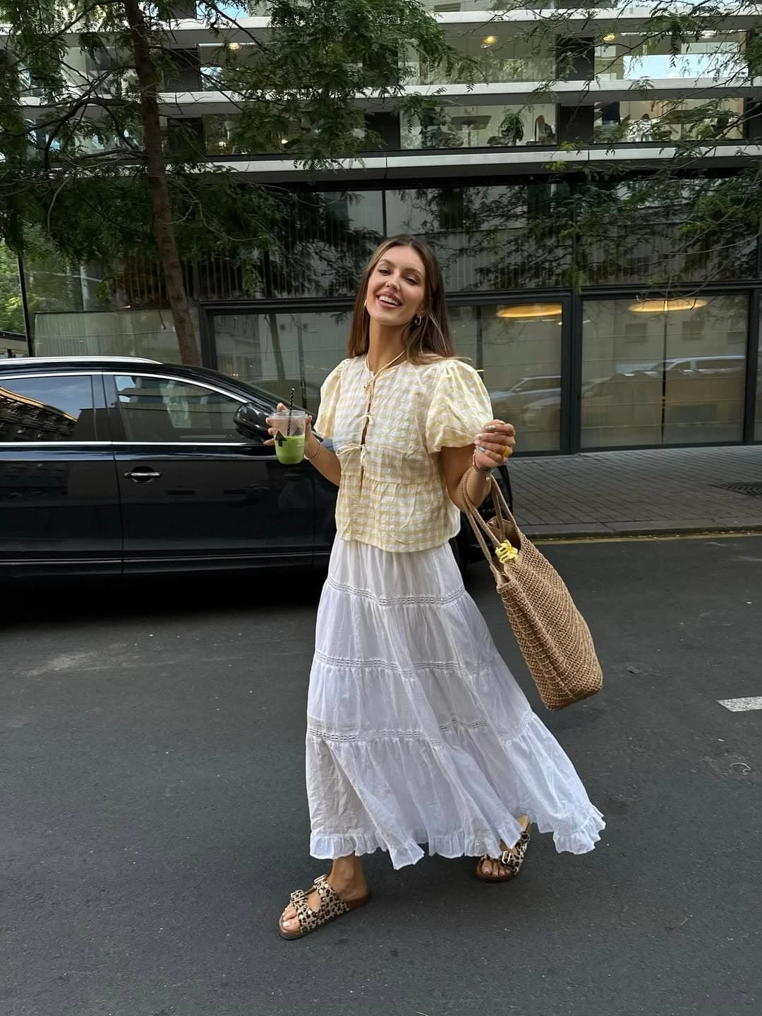 The woven bag and casual sandals keep everything grounded and relaxed. It’s bright, cheerful, and the kind of outfit that makes even a simple street walk feel like a little summer moment.