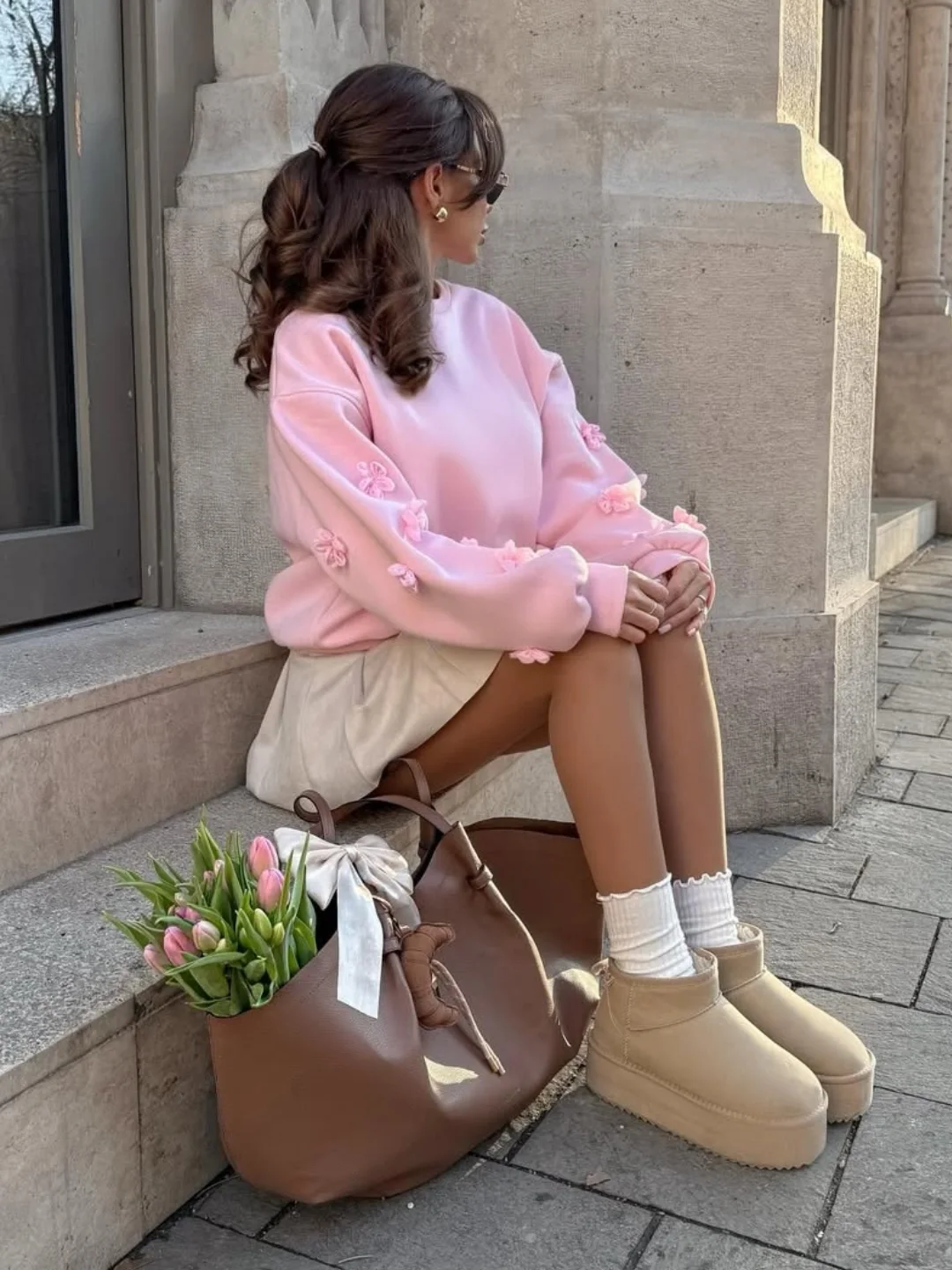 A blush pink sweatshirt with tiny floral details paired with a soft neutral skirt feels like the coziest version of the soft girl aesthetic. The textures are warm, relaxed, and just a little nostalgic.