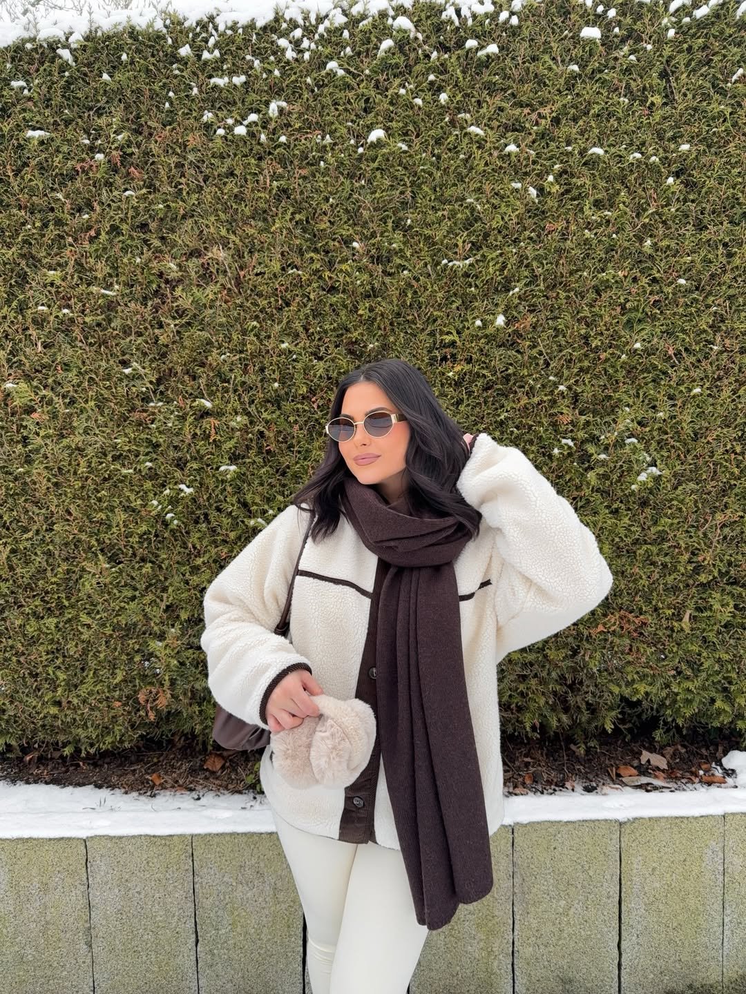 A plush shearling jacket with a deep brown scarf creates that cozy winter palette that always looks chic. The neutral tones feel calm and polished, while the oversized textures make the outfit feel warm and inviting.