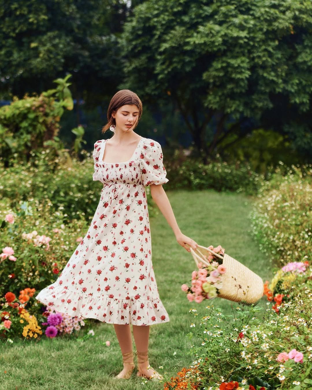 This floral midi feels like it walked straight out of a storybook. The puff sleeves, delicate red blooms, and that soft ruffled hem give it pure cottagecore energy — especially paired with a woven basket and fresh flowers in hand.