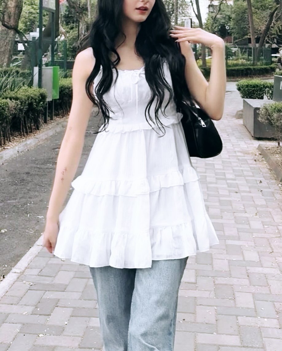 A tiered white babydoll top layered over relaxed denim is such a charming twist on everyday dressing. The ruffles bring softness while the jeans keep the outfit grounded and easy to wear.