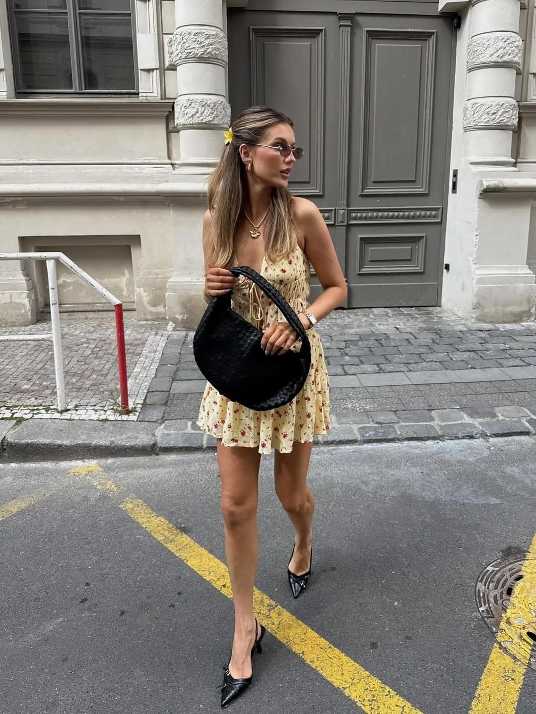 This little yellow floral mini dress is doing exactly what a great summer dress should do—simple, flattering, and ready for anything. The delicate straps and soft print give it that breezy charm that works perfectly for warm city days.