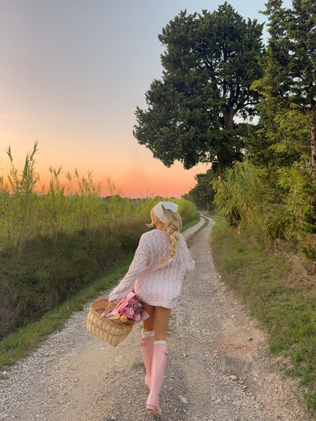 Oversized knit, pink rain boots, braided hair, and a basket in hand — this is countryside daydream energy. The sunset backdrop just amplifies the fairytale vibes.