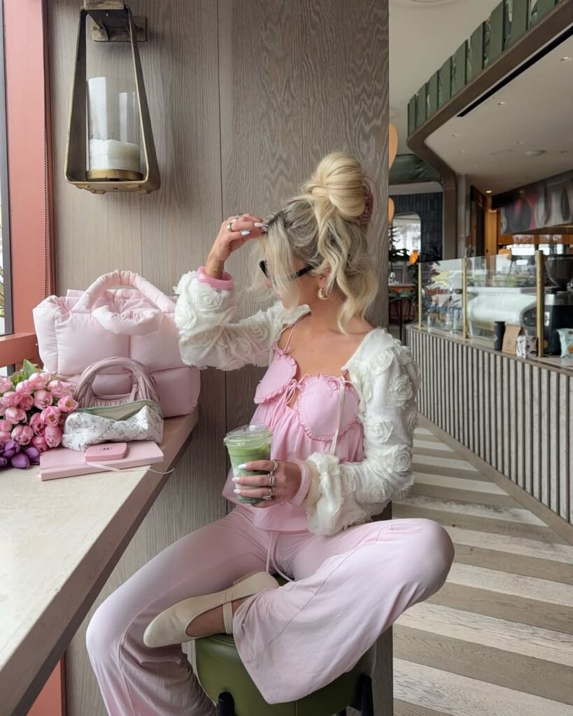 Everything about this look feels like a perfectly curated café moment. The soft pink lounge set paired with that delicate rosette cardigan leans fully into the romantic aesthetic, while the casual posture and matcha in hand keep it relaxed and real.