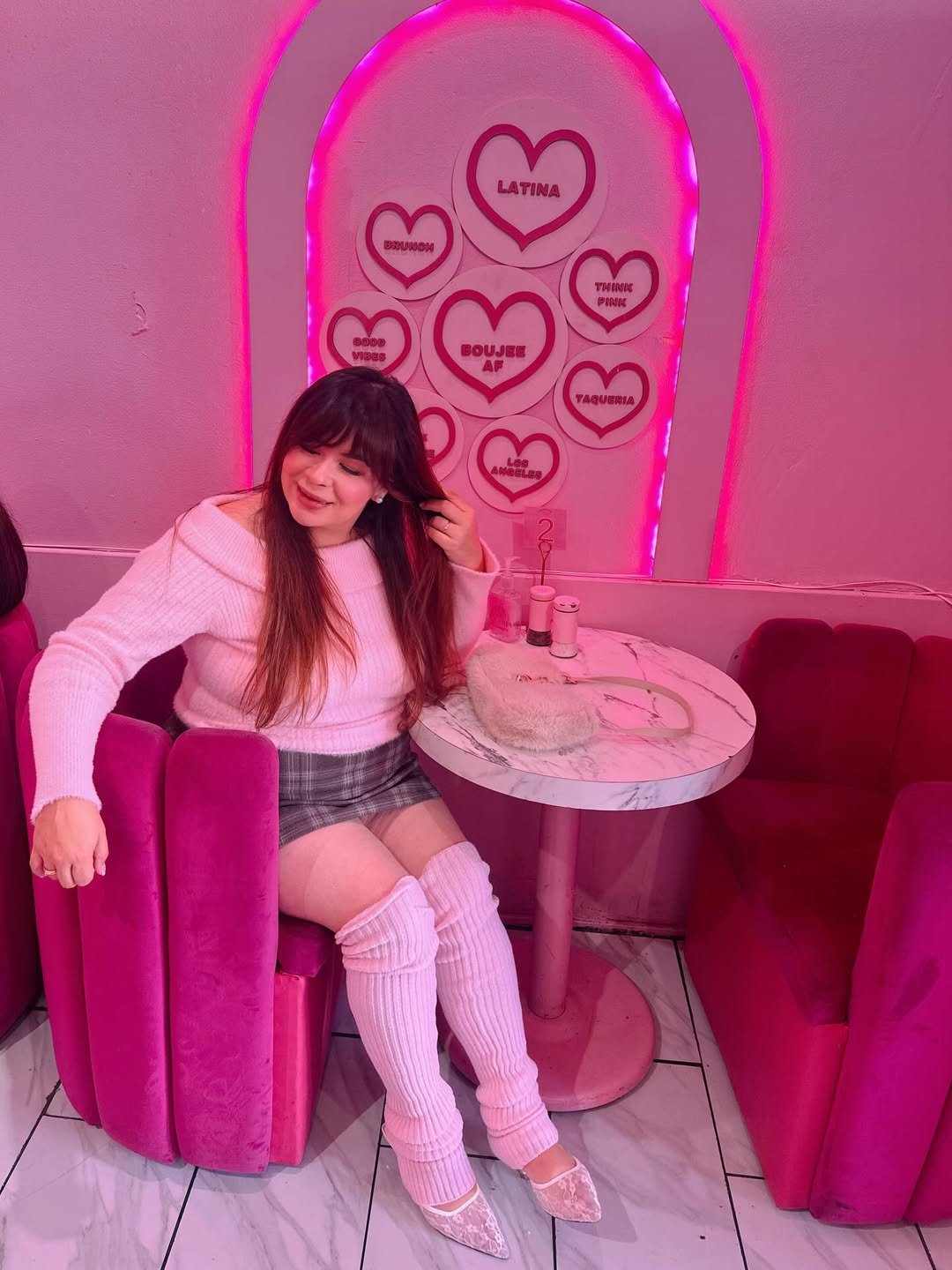 And the setting only makes it better. Surrounded by pink booths and glowing neon hearts, the outfit feels playful and flirty without trying too hard.