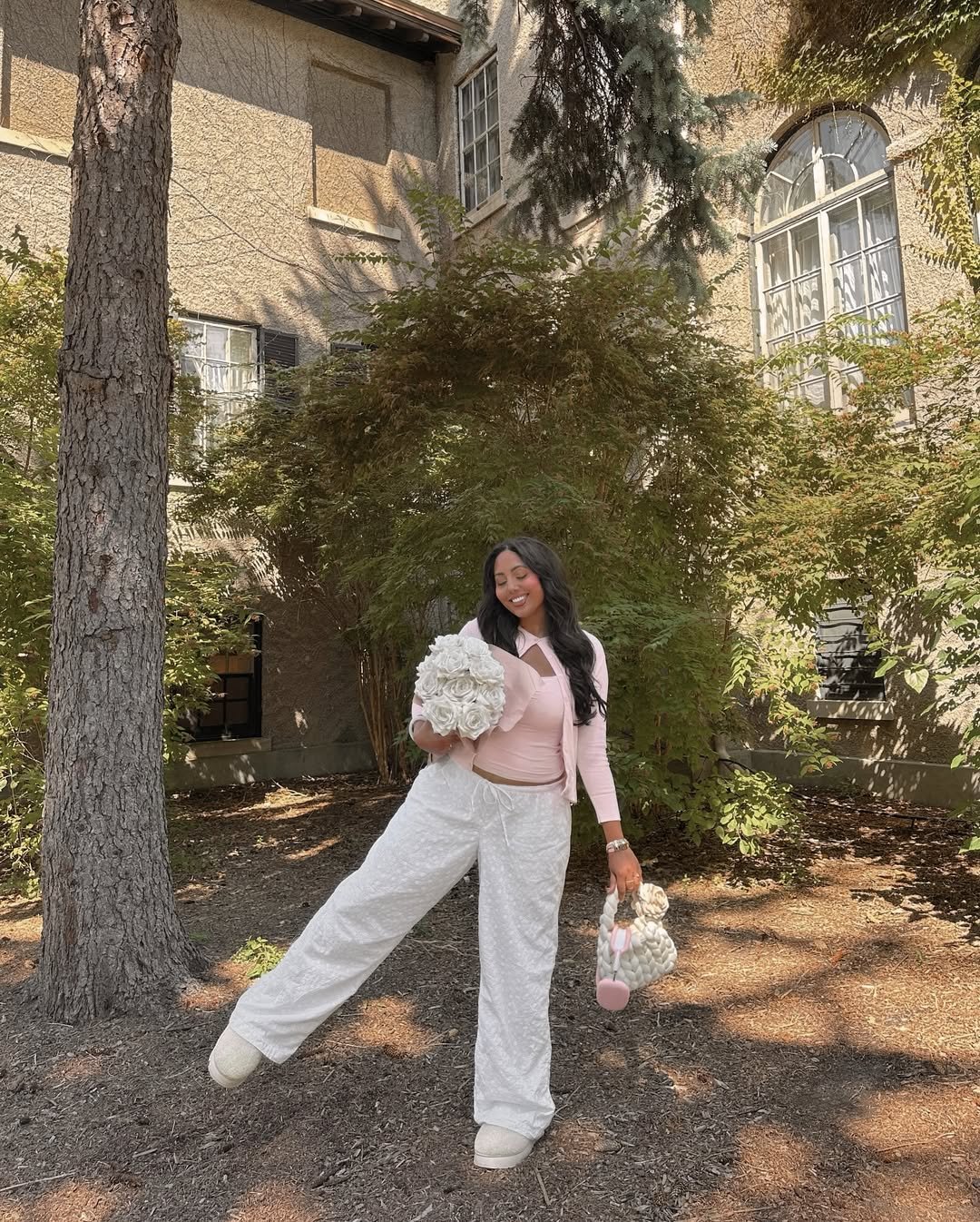 This soft pink cardigan paired with flowy white trousers is giving gentle, angel-core elegance. The bouquet detail just seals the deal — delicate, intentional, and oh-so-pretty.