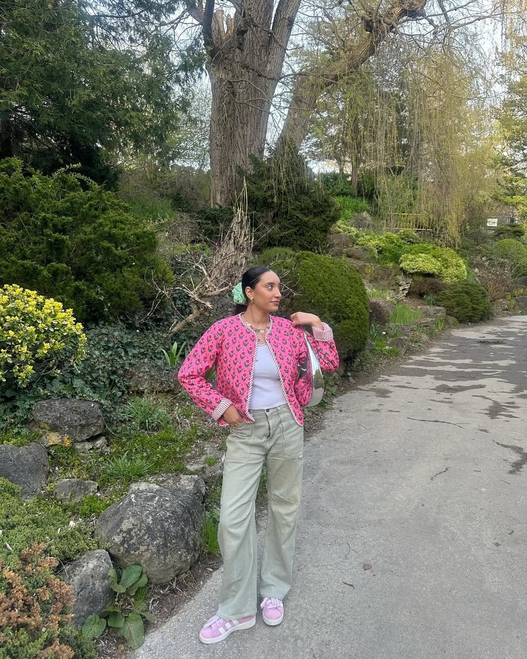 That pink printed jacket over a simple top and relaxed trousers is such a fun twist on soft girl styling. The colors are sweet, but the silhouette keeps it casual and wearable.