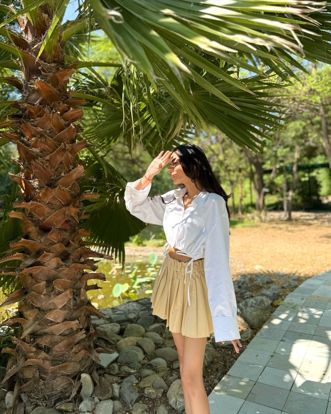 Crisp white blouse and a flowy beige mini skirt under palm trees — this look balances softness with a hint of summer glow. The lightweight fabrics keep it breezy and feminine.