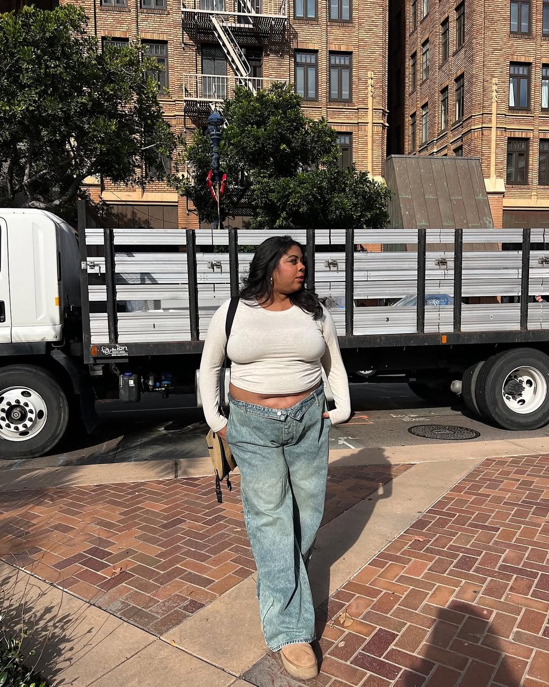 Cropped long-sleeve top with loose jeans? Yes please. The soft neutral palette keeps it feminine, while the relaxed denim adds that effortless, everyday edge.
