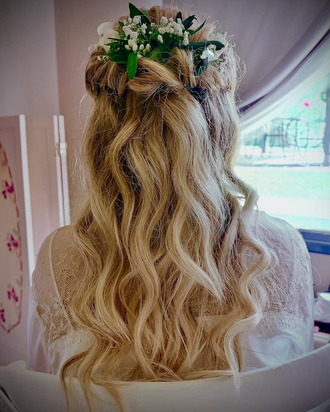 Soft waves paired with delicate florals instantly create a fairytale moment. The texture stays light and flowy, letting the accessories shine without overpowering the look.