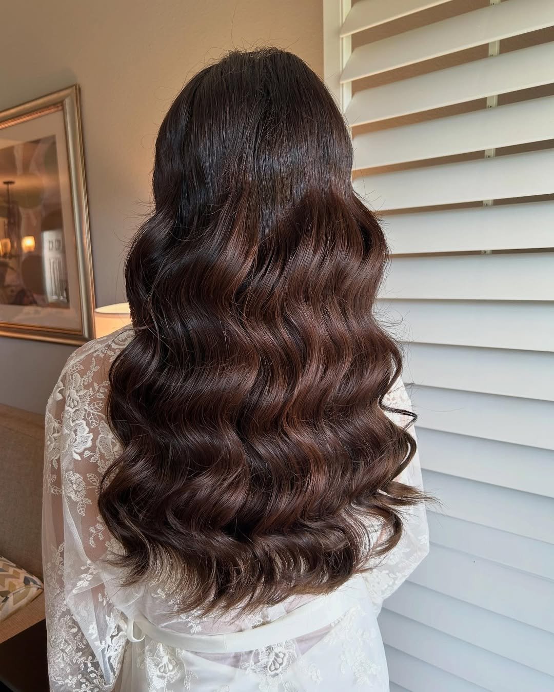 There’s something so quietly powerful about these deep, glossy waves. The finish is smooth without feeling stiff, and the movement feels intentional but not overdone—like elegance on autopilot. It’s the kind of hair that looks incredible from every angle, especially in soft indoor light.