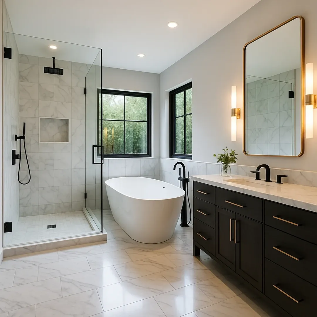 You’ve got the perfect mix here—glass shower, soaking tub, and that bold black vanity grounding everything.