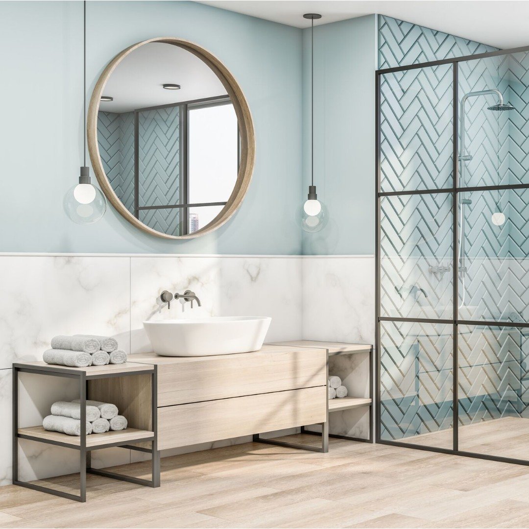This one feels crisp and refreshing. The soft blue tones, marble textures, and open shelving give it that airy spa aesthetic.