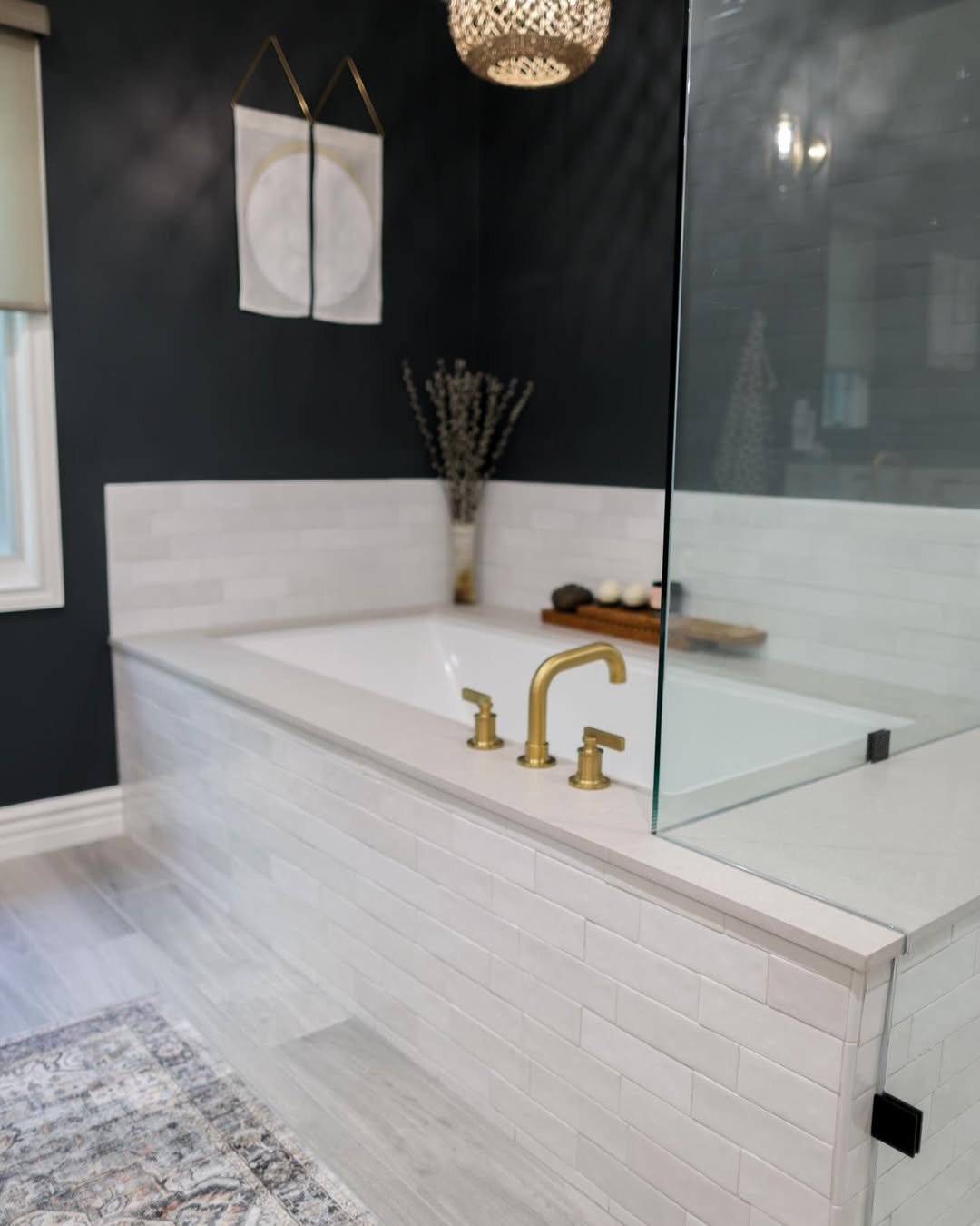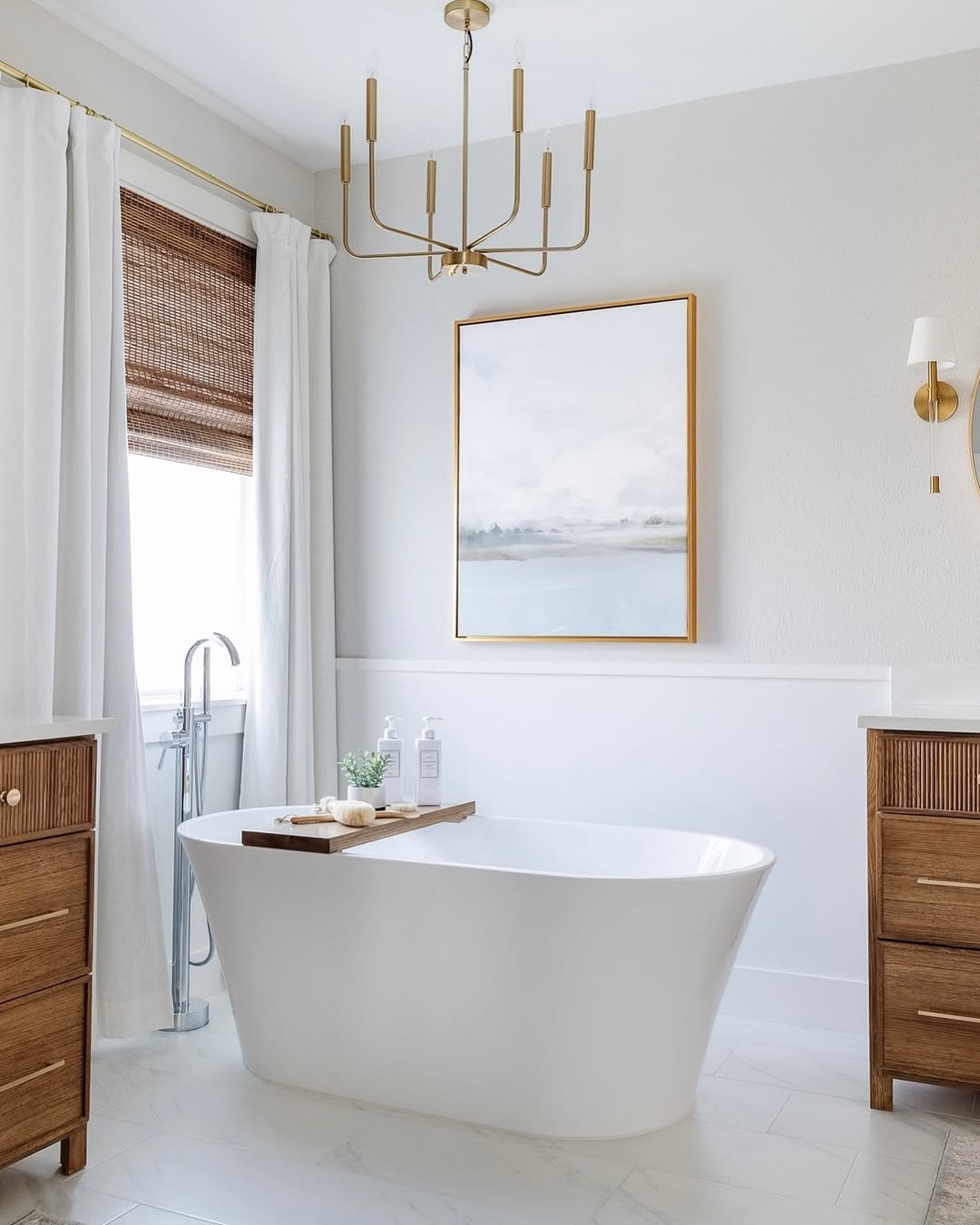 This one leans into timeless beauty. The freestanding tub, soft white palette, and natural light make it feel fresh but grounded.
