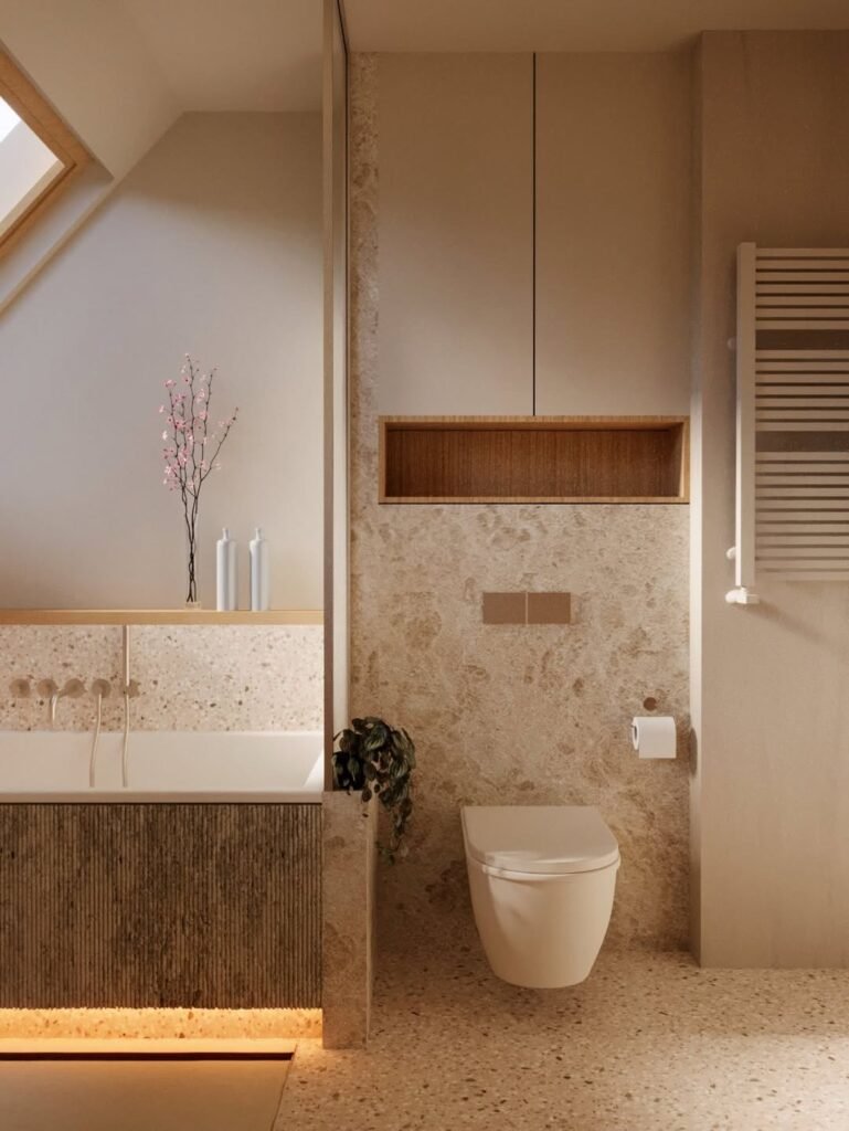 Everything here feels soft and grounded. The warm tones, subtle textures, and that built-in niche make it feel effortlessly curated.