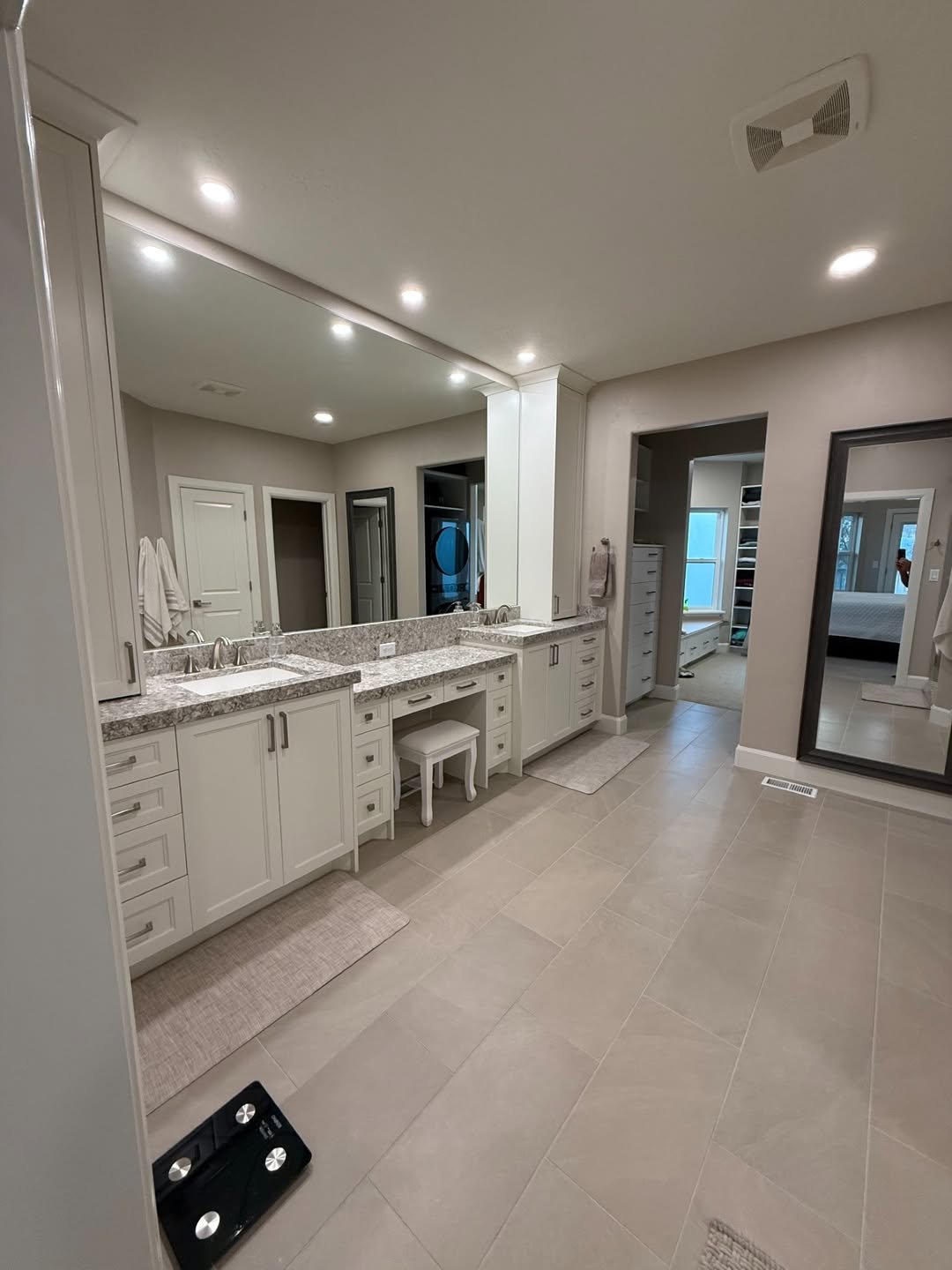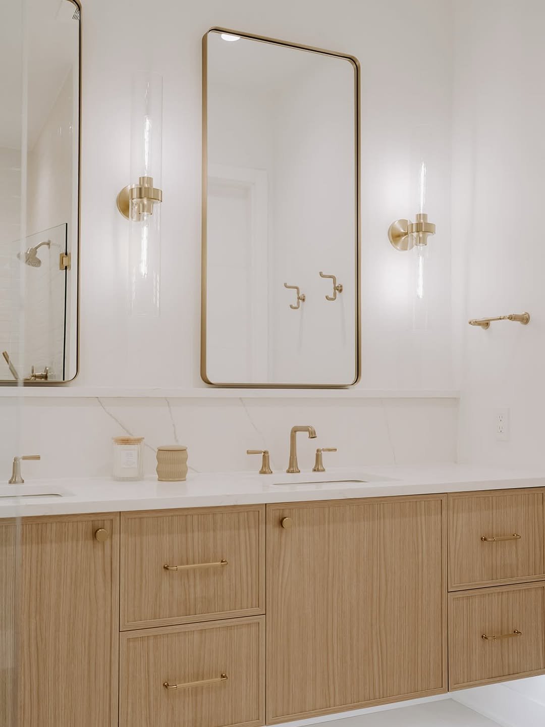 This is the kind of bathroom that quietly flexes. Double vanities, endless storage, and that full wall mirror—it’s giving hotel suite energy but made for real life.