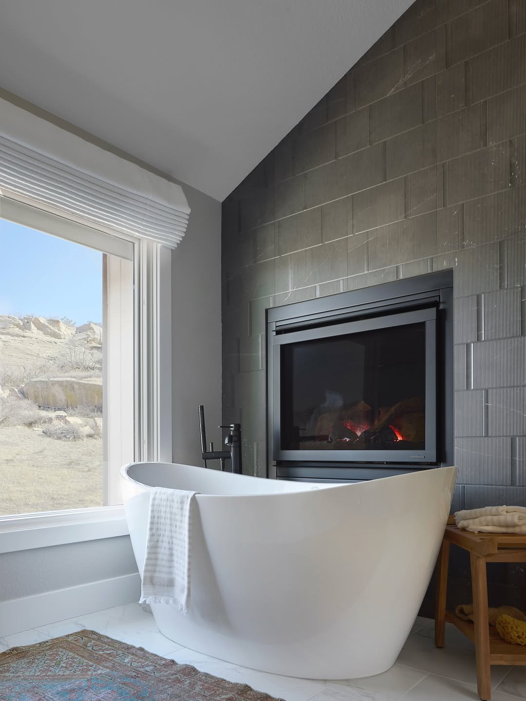 Okay, this is next-level cozy. A soaking tub with a fireplace right next to it? That’s not just a bathroom, that’s an experience.