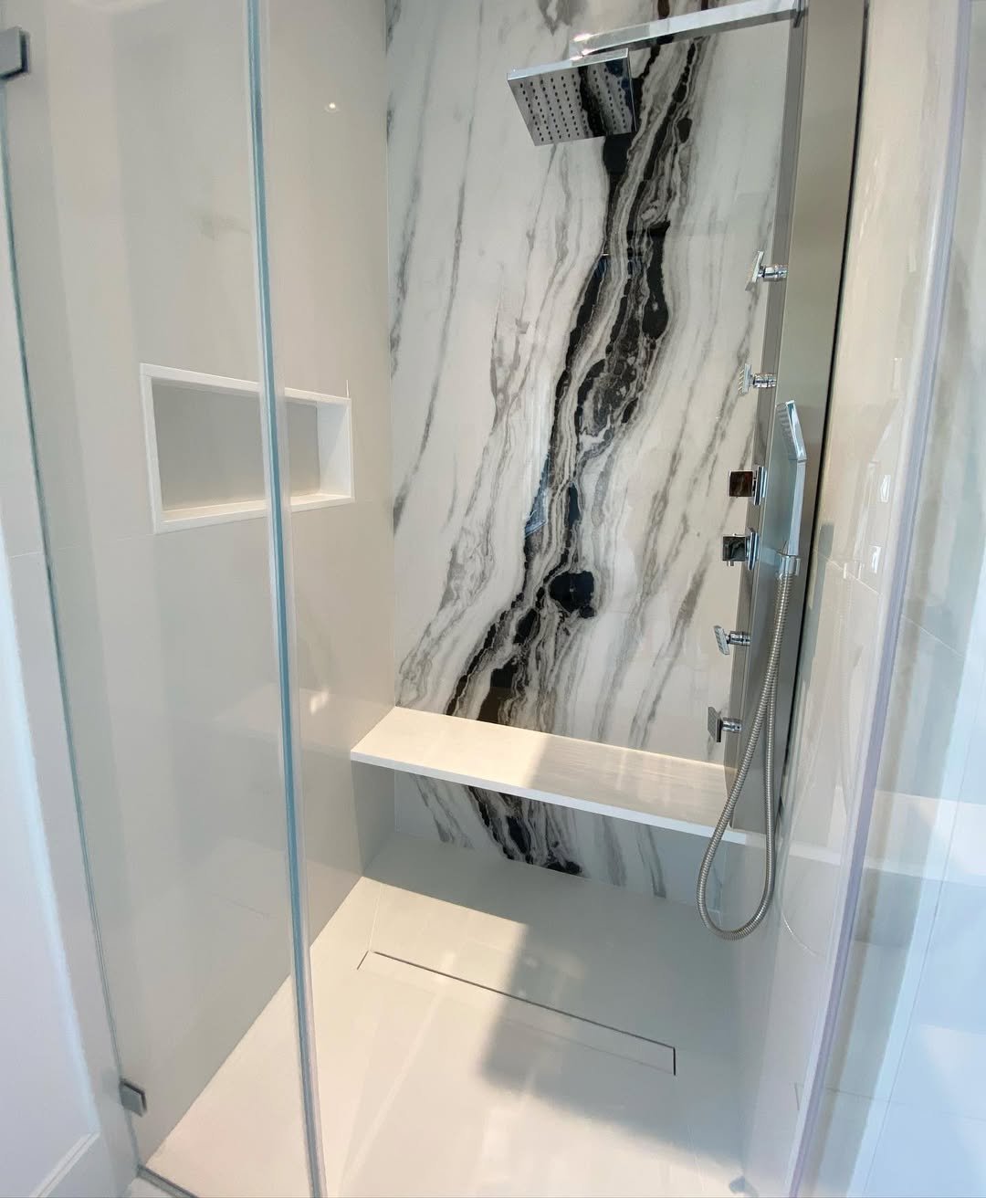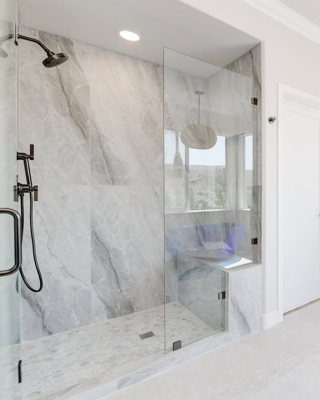 That marble slab is doing all the talking—and honestly, it should. It turns a simple shower into a full design moment.